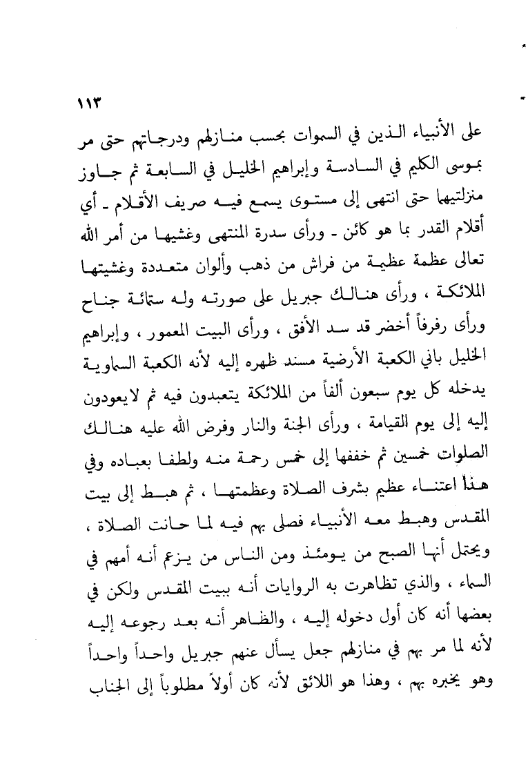 على الأنبياء الذين في السموات بحسب منازلهم ودرجاتهم حتى مر بموسى الكليم في السادسة وإبراهيم الخليل في السابعة ثم جاوز منزلتيهما حتى انتهى إلى مستوى يسمع فيه صريف الأقلام - أي أقلام القدر بما هو كائن - ورأى سدرة المنتهى وغشيها من أمر الله تعالى عظمة عظيمة من فراش من ذهب وألوان متعددة وغشيتها الملائكة, ورأى هنالك جبريل على صورته وله ستمائة جناح ورأى رفرفاً أخضر قد سد الأفق, ورأى البيت المعمور, وإبراهيم الخليل باني الكعبة الأرضية مسند ظهره إليه لأنه الكعبة السماوية يدخله كل يوم سبعون ألفاً من الملائكة يتعبدون فيه ثم لا يعودون إليه إلى يوم القيامة, ورأى الجنة والنار وفرض الله عليه هنالك الصلوات خمسين ثم خففها إلى خمس رحمة منه ولطفا بعباده وفي هذا اعتناء عظيم بشرف الصلاة وعظمتها, ثم هبط إلى بيت المقدس وهبط معه الأنبياء فصلى بهم فيه لما حانت الصلاة, ويحتمل أنها الصبح من يومئذ ومن الناس من يزعم أنه أمهم في السماء, والذي تظاهرت به الروايات أنه ببيت المقدس ولكن في بعضها أنه كان أول دخوله إليه, والظاهر أنه بعد رجوعه إليه لأنه لما مر بهم في منازلهم جعل يسأل عنهم جبريل واحداً واحداً وهو يخبره بهم, وهذا هو اللائق لأنه كان أولاً مطلوباً إلى الجناب