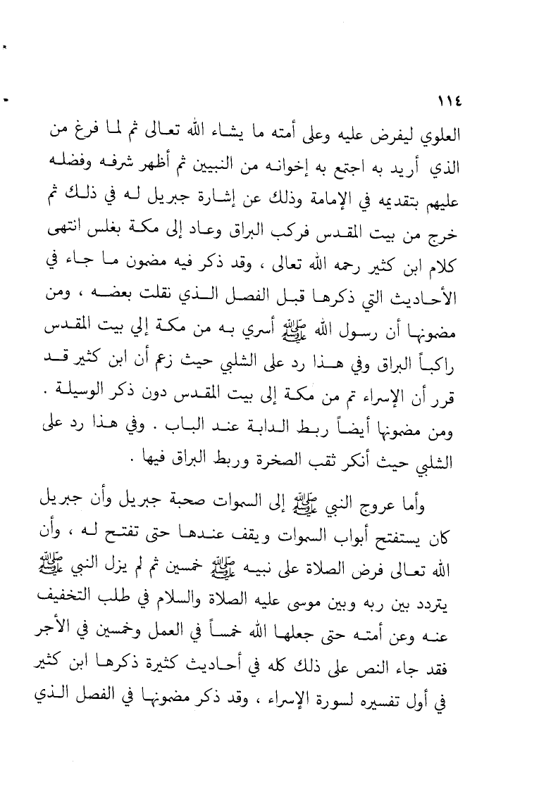 العلوي ليفرض عليه وعلى أمته ما يشاء الله تعالى ثم لما فرغ من الذي أريد به اجتمع به إخوانه من النبيين ثم أظهر شرفه وفضله عليهم بتقديمه في الإمامة وذلك عن إشارة جبريل له في ذلك ثم خرج من بيت المقدس فركب البراق وعاد إلى مكة بغلس انتهى كلام ابن كثير رحمه الله تعالى, وقد ذكر فيه مضمون ما جاء في الأحاديث التي ذكرها قبل الفصل الذي نقلت بعضه, ومن مضمونها أن رسول الله - صلى الله عليه وسلم - أسرى به من مكة إلى بيت المقدس راكباً البراق وفي هذا رد على الشلبي حيث زعم أن ابن كثير قد قرر أن الإسراء تم من مكة إلى بيت المقدس دون ذكر الوسيلة. ومن مضمونها أيضاً ربط الدابة عند الباب. وفي هذا رد على الشلبي حيث أنكر ثقب الصخرة وربط البراق فيها.
