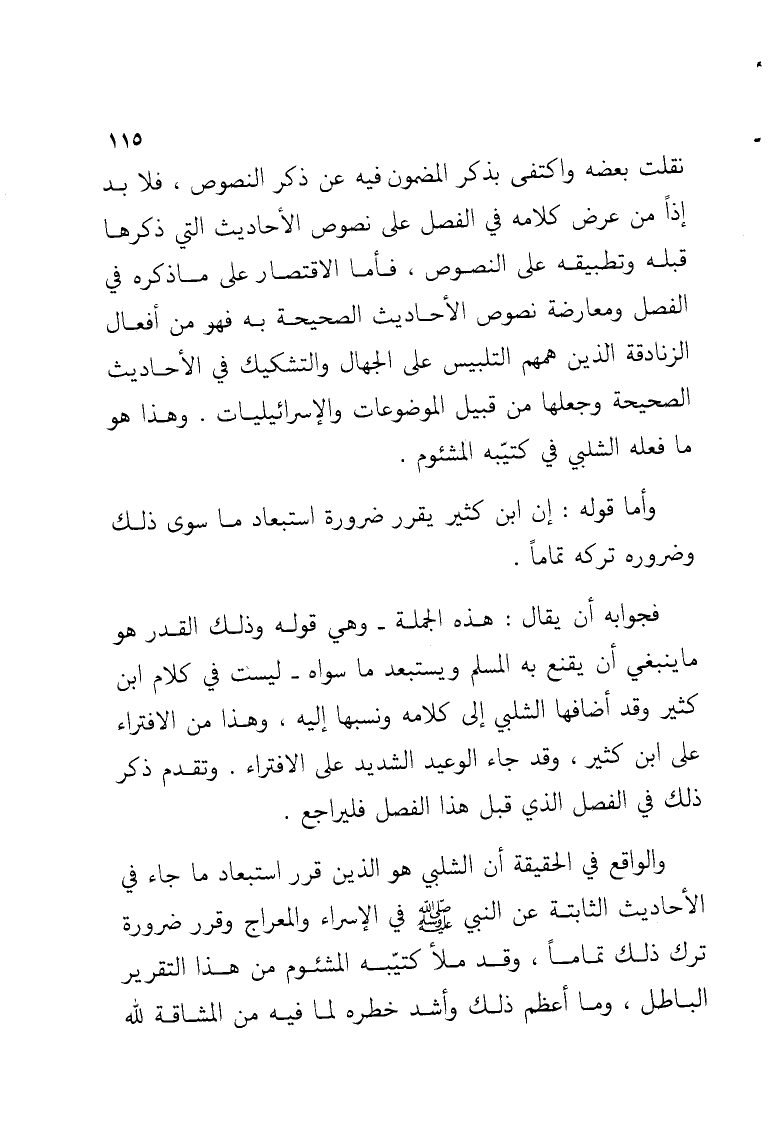 نقلت بعضه واكتفى بذكر المضمون فيه عن ذكر النصوص, فلا بد إذاً من عرض كلامه في الفصل على نصوص الأحاديث التي ذكرها قبله وتطبيقه على النصوص, فأما الاقتصار على ما ذكره في الفصل ومعارضة نصوص الأحاديث الصحيحة به فهو من أفعال الزنادقة الذين همهم التلبيس على الجهال والتشكيك في الأحاديث الصحيحة وجعلها من قبيل الموضوعات والإسرائيليات. وهذا هو ما فعله الشلبي في كتيّبه المشئوم.