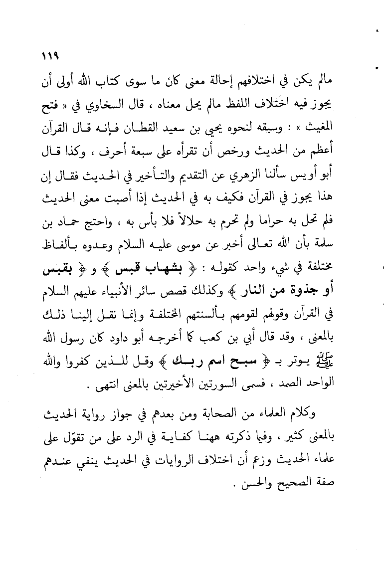 ما لم يكن في اختلافهم إحالة معنى ما كان سوى كتاب الله أولى أن يجوز فيه اختلاف اللفظ ما لم يحل معناه, قال السخاوي في «فتح المغيث»: وسبقه لنحوه يحيى بن سعيد القطان فإنه قال القرآن أعظم من الحديث ورخص أن تقرأه على سبعة أحرف, وكذا قال أبو أويس سألنا الزهري عن التقديم والتأخير في الحديث فقال إن هذا يجوز في القرآن فكيف به في الحديث إذا أصبت معنى الحديث فلم تحل به حراما ولم تحرم به حلالاً فلا بأس به, واحتج حماد بن سلمة بأن الله تعالى أخبر عن موسى عليه السلام وعدوه بألفاظ مختلفة في شيء واحد كقوله: {بشهاب قبس} و {بقبس أو جذوة من النار} وكذلك قصص سائر الأنبياء عليهم السلام في القرآن وقولهم لقومهم بألسنتهم المختلفة وإنما نقل إلينا ذلك بالمعنى, وقد قال أبي بن كعب كما أخرجه أبو داود كان رسول الله - صلى الله عليه وسلم - يوتر بـ {سبح اسم ربك} وقل للذين كفروا والله الواحد الصمد, فسمى السورتين الأخيرتين بالمعنى انتهى.