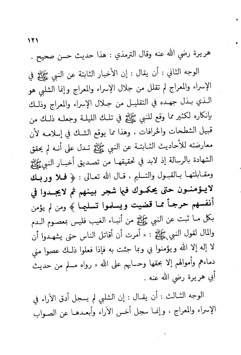 الوجه الثاني: أن يقال: إن الأخبار الثابتة عن النبي - صلى الله عليه وسلم - في الإسراء والمعراج لم تقلل من جلال الإسراء والمعراج وإنما الشلبي هو الذي بذل جهده في التقليل من جلال الإسراء والمعراج وذلك بإنكاره لكثير مما وقع للنبي - صلى الله عليه وسلم - في تلك الليلة وجعله ذلك من قبيل الشطحات والخرافات, وهذا مما يوقع الشك في إسلامه لأن معارضته للأحاديث الثابتة عن النبي - صلى الله عليه وسلم - تدل على أنه لم يحقق الشهادة بالرسالة إذ لا بد في تحقيقها من تصديق أخبار النبي - صلى الله عليه وسلم - ومقابلتها بالقبول والتسليم, قال الله تعالى: {فلا وربك لا يؤمنون حتى يحكموك فيما شجر بينهم ثم لا يجدوا في أنفسهم حرجاً مما قضيت ويسلموا تسليما} ومن لم يؤمن بكل ما ثبت عن النبي - صلى الله عليه وسلم - من أنباء الغيب فليس بمعصوم الدم والمال لقول النبي - صلى الله عليه وسلم -: «أمرت أن أقاتل الناس حتى يشهدوا أن لا إله إلا الله ويؤمنوا بي وبما جئت به فإذا فعلوا ذلك عصموا مني دماءهم وأموالهم إلا بحقها وحسابهم على الله» رواه مسلم من حديث أبي هريرة رضي الله عنه.
