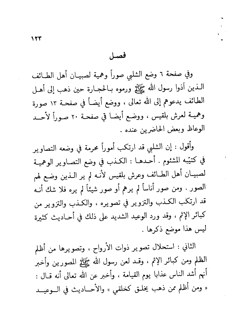 وأقول: إن الشلبي قد ارتكب أموراً محرمة في وضعه التصاوير في كتيّبه المشئوم. أحدها: الكذب في وضع التصاوير الوهمية لصبيان أهل الطائف وعرش بلقيس لأنه لم ير الذين وضع لهم الصور. ومن صور أناساً لم يرهم أو صور شيئاً لم يره فلا شك أنه قد ارتكب الكذب والتزوير في تصويره, والكذب والتزوير من كبائر الإثم, وقد ورد الوعيد الشديد على ذلك في أحاديث كثيرة ليس هذا موضع ذكرها.