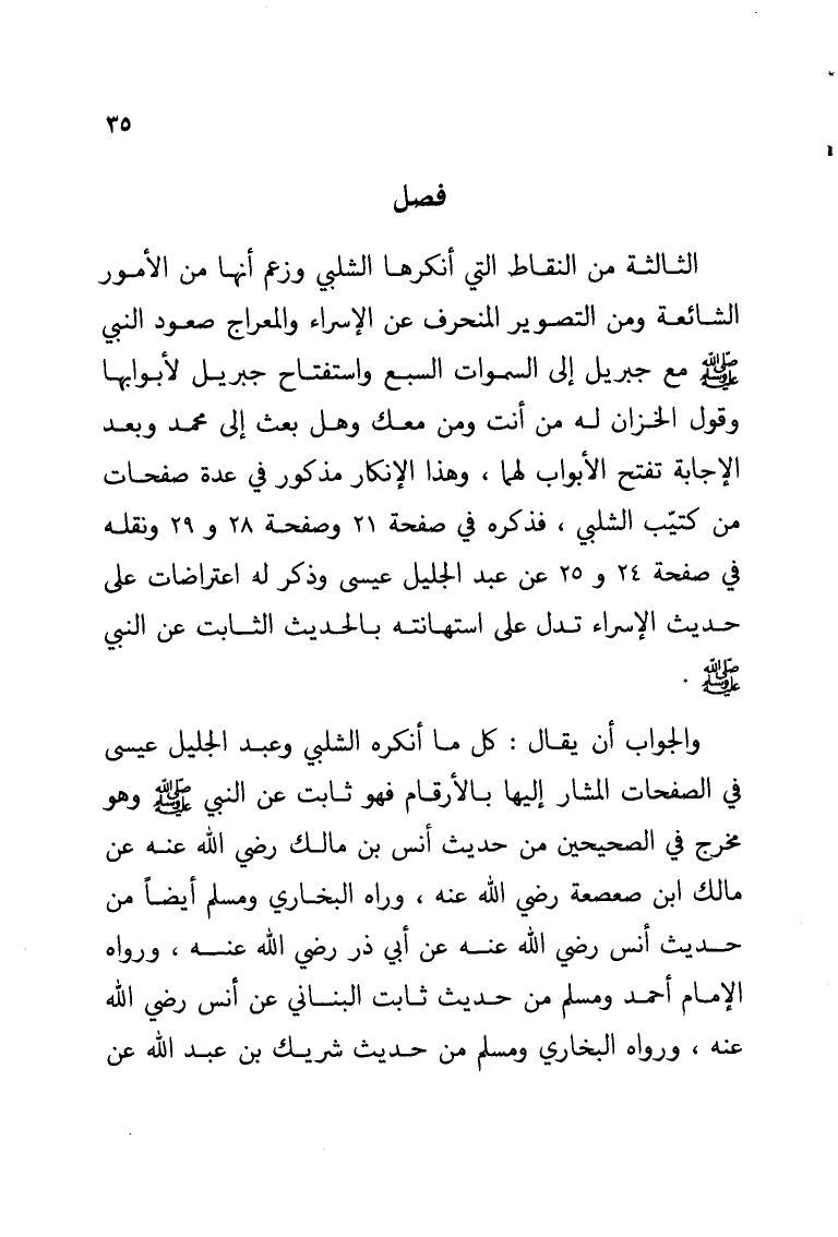 والجواب أن يقال: كل ما أنكره الشلبي وعبدالجليل عيسى في الصفحات المشار إليها بالأرقام فهو ثابت عن النبي - صلى الله عليه وسلم - وهو مخرج في الصحيحين من حديث أنس بن مالك رضي الله عنه عن مالك ابن صعصعة رضي الله عنه, ورواه البخاري ومسلم أيضاً من حديث أنس رضي الله عنه عن أبي ذر رضي الله عنه, ورواه الإمام أحمد ومسلم من حديث ثابت البناني عن أنس رضي الله عنه, ورواه البخاري ومسلم من حديث شريك بن عبدالله عن