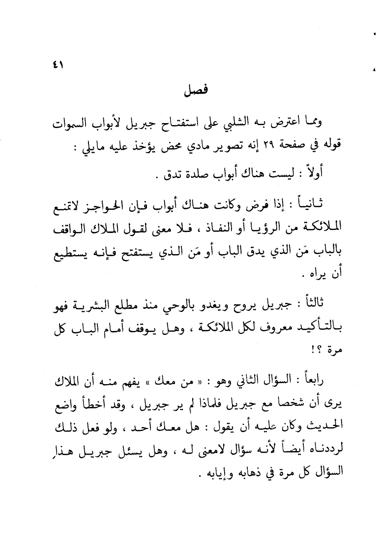 ومما اعترض به الشلبي على استفتاح جبريل لأبواب السموات قوله في صفحة 29 إنه تصوير مادي محض يؤخذ عليه ما يلي: