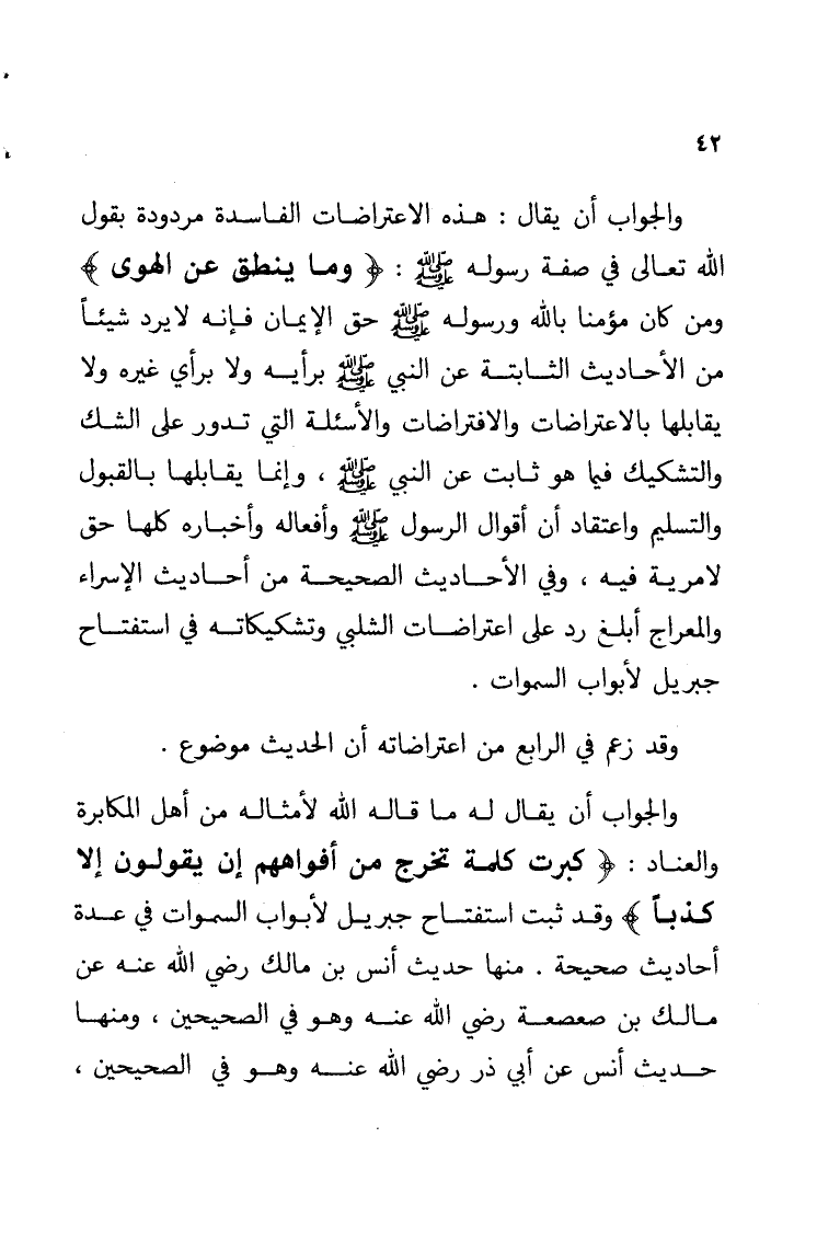 والجواب أن يقال: هذه الاعتراضات الفاسدة مردودة بقول الله تعالى في صفة رسوله - صلى الله عليه وسلم -: {وما ينطق عن الهوى} ومن كان مؤمنا بالله ورسوله - صلى الله عليه وسلم - حق الإيمان فإنه لا يرد شيئاً من الأحاديث الثابتة عن النبي - صلى الله عليه وسلم - برأيه ولا برأي غيره ولا يقابلها بالاعتراضات والافتراضات والأسئلة التي تدور على الشك والتشكيك فيما هو ثابت عن النبي - صلى الله عليه وسلم - , وإنما يقابلها بالقبول والتسليم واعتقاد أن أقوال الرسول - صلى الله عليه وسلم - وأفعاله وأخباره كلها حق لا مرية فيه, وفي الأحاديث الصحيحة من أحاديث الإسراء والمعراج أبلغ رد على اعتراضات الشلبي وتشكيكاته في استفتاح جبريل لأبواب السموات.