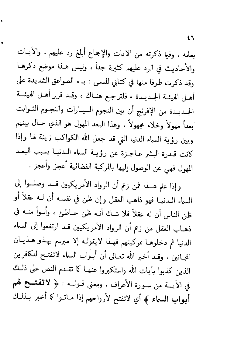 بعلمه, وفيما ذكرته من الآيات والإجماع أبلغ رد عليهم, والآيات والأحاديث في الرد عليهم كثيرة جداً, وليس هذا موضع ذكرها وقد ذكرت طرفا منها في كتابي المسمى: بـ «الصواعق الشديدة على أهل الهيئة الجديدة» فلتراجع هناك, وقد قرر أهل الهيئة الجديدة من الإفرنج أن بين النجوم السيارات والنجوم الثوابت بعداً مهولاً وخلاء مجهولاً, وهذا البعد المهول هو الذي حال بينهم وبين رؤية السماء الدنيا التي قد جعل الله الكواكب زينة لها وإذا كانت قدرة البشر عاجزة عن رؤية السماء الدنيا بسبب البعد المهول فهي عن الوصول إليها بالمركبة الفضائية أعجز وأعجز.