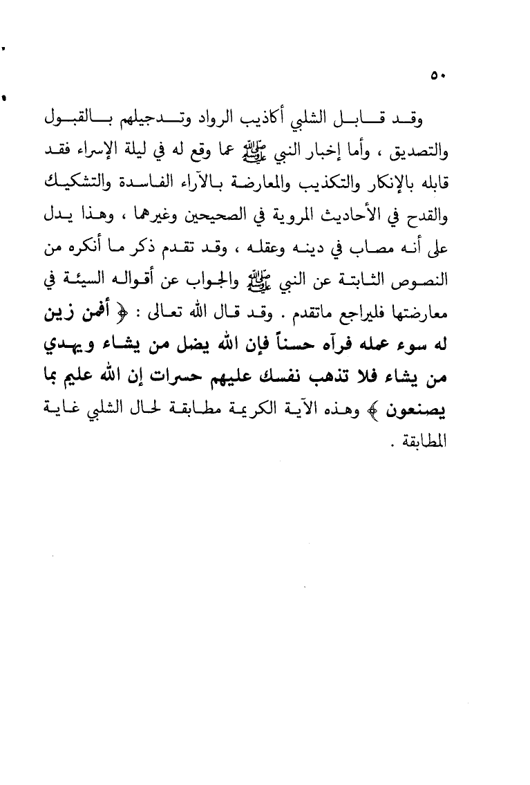 وقد قابل الشلبي أكاذيب الرواد وتدجيلهم بالقبول والتصديق, وأما أخبار النبي - صلى الله عليه وسلم - عما وقع له في ليلة الإسراء فقد قابله بالإنكار والتكذيب والمعارضة بالآراء الفاسدة والتشكيك والقدح في الأحاديث المروية في الصحيحين وغيرهما, وهذا يدل على أنه مصاب في دينه وعقله, وقد تقدم ذكر ما أنكره من النصوص الثابتة عن النبي - صلى الله عليه وسلم - والجواب عن أقواله السيئة في معارضتها فليراجع ما تقدم. وقد قال الله تعالى: {أفمن زين له سوء عمله فرآه حسناً فإن الله يضل من يشاء ويهدي من يشاء فلا تذهب نفسك عليهم حسرات إن الله عليم بما يصنعون} وهذه الآية الكريمة مطابقة لحال الشلبي غاية المطابقة.