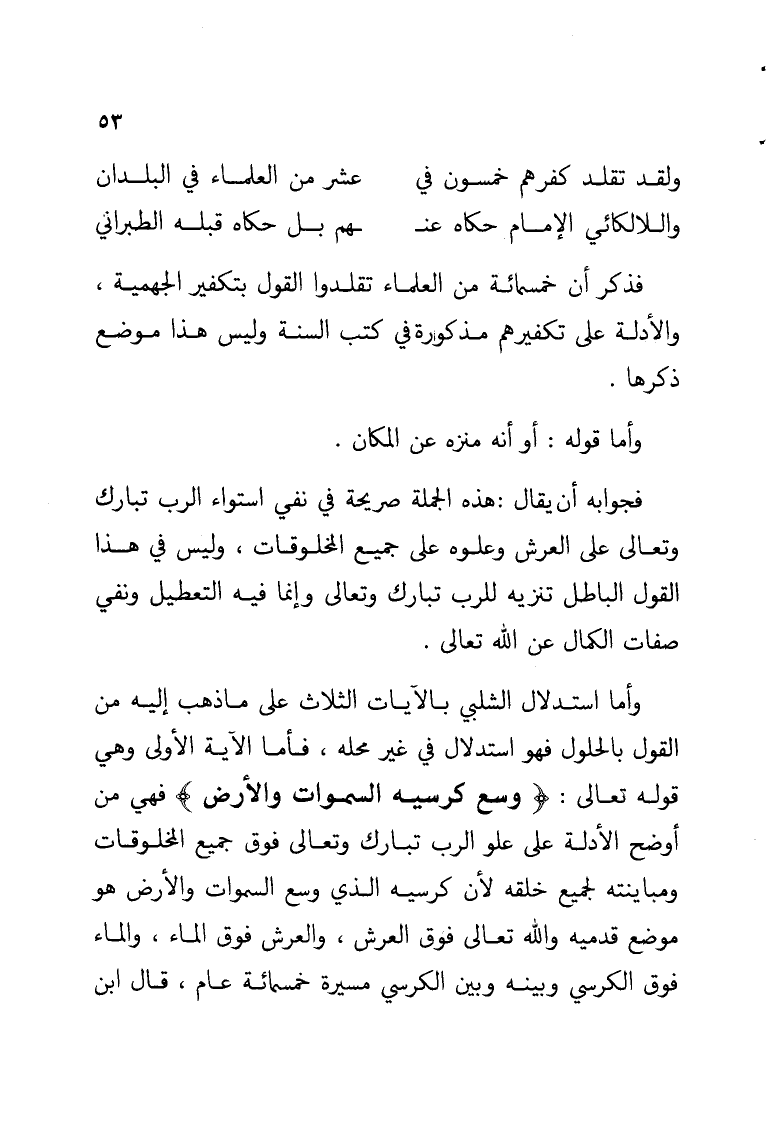 وأما استدلال الشلبي بالآيات الثلاث على ما ذهب إليه من القول بالحلول فهو استدلال في غير محله, فأما الآية الأولى وهي قوله تعالى: {وسع كرسيه السموات والأرض} فهي من أوضح الأدلة على علو الرب تبارك وتعالى فوق جميع المخلوقات ومباينته لجميع خلقه لأن كرسيه الذي وسع السموات والأرض هو موضع قدميه والله تعالى فوق العرش, والعرش فوق الماء, والماء فوق الكرسي وبينه وبين الكرسي مسيرة خمسمائة عام, قال ابن