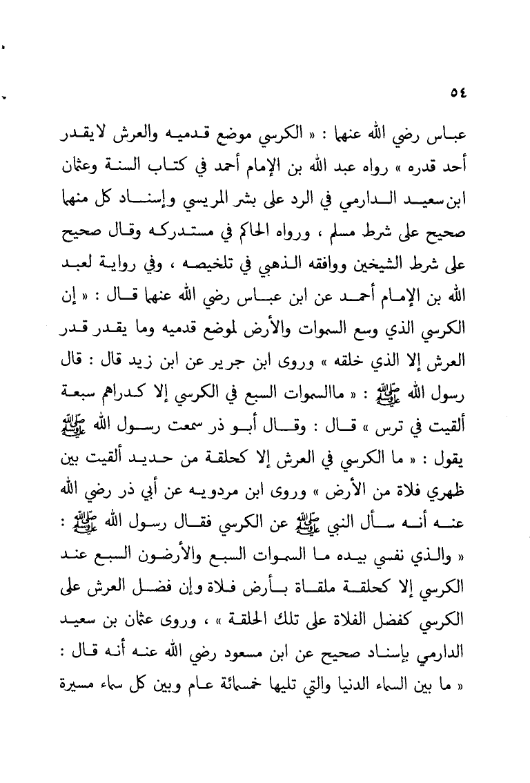 عباس رضي الله عنهما: «الكرسي موضع قدميه والعرش لا يقدر أحد قدره» رواه عبدالله بن الإمام أحمد في كتاب السنة وعثمان ابن سعيد الدارمي في الرد على بشر المريسي وإسناد كل منهما صحيح على شرط مسلم, ورواه الحاكم في مستدركه وقال صحيح على شرط الشيخين ووافقه الذهبي في تلخيصه, وفي رواية لعبدالله بن الإمام أحمد عن ابن عباس رضي الله عنهما قال: «إن الكرسي الذي وسع السموات والأرض لموضع قدميه وما يقدر قدر العرش إلا الذي خلقه» وروى ابن جرير عن ابن زيد قال: قال رسول الله - صلى الله عليه وسلم -: «ما السموات السبع في الكرسي إلا كدراهم سبعة ألقيت في ترس» قال: وقال أبو ذر سمعت رسول الله - صلى الله عليه وسلم - يقول: «ما الكرسي في العرش إلا كحلقة من حديد ألقيت بين ظهري فلاة من الأرض» وروى ابن مردويه عن أبي ذر رضي الله عنه أنه سأل النبي - صلى الله عليه وسلم - عن الكرسي فقال رسول الله - صلى الله عليه وسلم -: «والذي نفسي بيده ما السموات السبع والأرضون السبع عند الكرسي إلا كحلقة ملقاة بأرض فلاة وإن فضل العرش على الكرسي كفضل الفلاة على تلك الحلقة» , وروى عثمان بن سعيد الدارمي بإسناد صحيح عن ابن مسعود رضي الله عنه أنه قال: «ما بين السماء الدنيا والتي تليها خمسمائة عام وبين كل سماء مسيرة