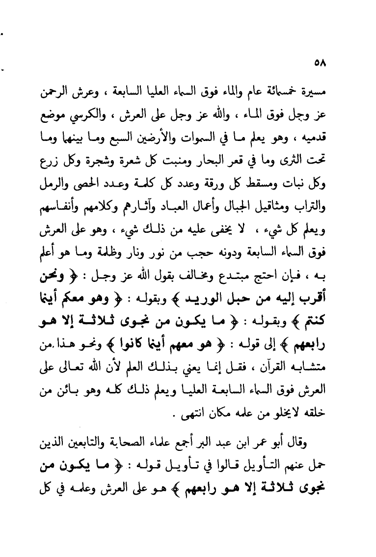 وقال أبو عمر ابن عبدالبر أجمع علماء الصحابة والتابعين الذين حمل عنهم التأويل قالوا في تأويل قوله: {ما يكون من نجوى ثلاثة إلا هو رابعهم} هو على العرش وعلمه في كل
