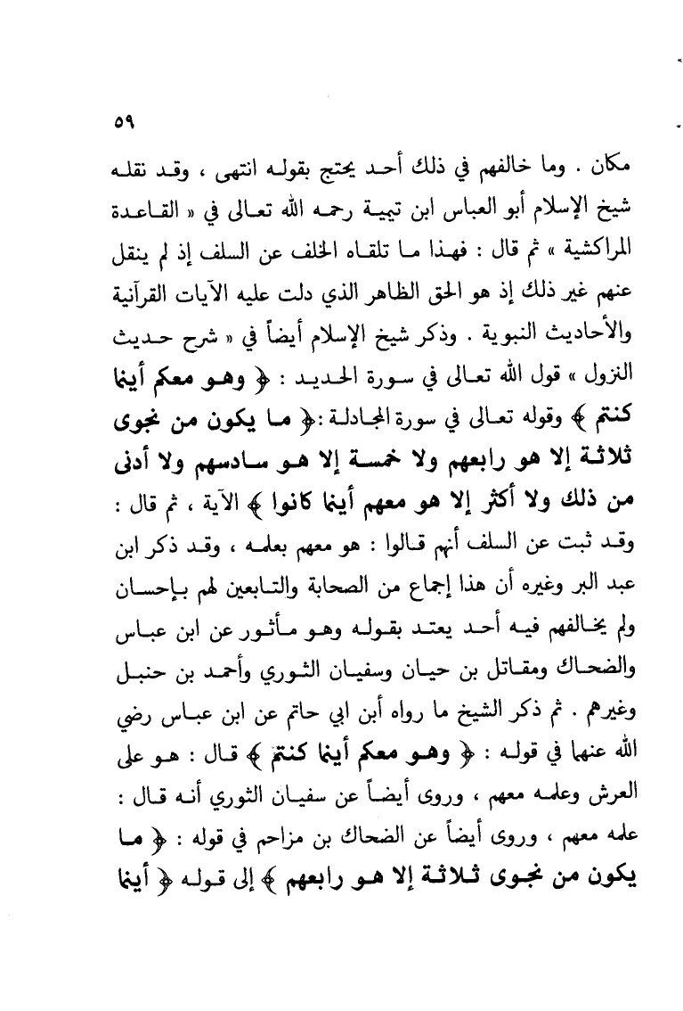 مكان. وما خالفهم في ذلك أحد يحتج بقوله انتهى, وقد نقله شيخ الإسلام أبو العباس ابن تيمية رحمه الله تعالى في «القاعدة المراكشية» ثم قال: فهذا ما تلقاه الخلف عن السلف إذ لم ينقل عنهم غير ذلك إذ هو الحق الظاهر الذي دلت عليه الآيات القرآنية والأحاديث النبوية. وذكر شيخ الإسلام أيضاً في «شرح حديث النزول» قول الله تعالى في سورة الحديد: {وهو معكم أينما كنتم} وقوله تعالى في سورة المجادلة {ما يكون من نجوى ثلاثة إلا هو رابعهم ولا خمسة إلا هو سادسهم ولا أدنى من ذلك ولا أكثر إلا هو معهم أينما كانوا} الآية, ثم قال: وقد ثبت عن السلف أنهم قالوا: هو معهم بعلمه, وقد ذكر ابن عبدالبر وغيره أن هذا إجماع من الصحابة والتابعين لهم بإحسان ولم يخالفهم فيه أحد يعتد بقوله وهو مأثور عن ابن عباس والضحاك ومقاتل بن حيان وسفيان الثوري وأحمد بن حنبل وغيرهم. ثم ذكر الشيخ ما رواه ابن أبي حاتم عن ابن عباس رضي الله عنهما في قوله: {وهو معكم أينما كنتم} قال: هو على العرش وعلمه معهم, وروى أيضاً عن سفيان الثوري أنه قال: علمه معهم، وروى أيضاً عن الضحاك بن مزاحم في قوله: {ما يكون من نجوى ثلاثة إلا هو رابعهم} إلى قوله {أينما