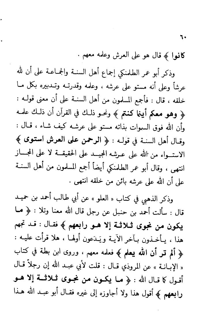 وذكر الذهبي في كتاب «العلو» عن أبي طالب أحمد بن حميد قال: سألت أحمد بن حنبل عن رجل قال الله معنا وتلا: {ما يكون من نجوى ثلاثة إلا هو رابعهم} فقال: قد تجهم هذا, يأخذون بآخر الآية ويَدَعون أولها, هلا قرأت عليه: {ألم تر أن الله يعلم} فعلمه معهم, وروى ابن بطة في كتاب «الإبانة» عن المروذي قال: قلِت لأبي عبدالله إن رجلاً قال أقول كما قال الله: {ما يكون من نجوى ثلاثة إلا هو رابعهم} أقول هذا ولا أجاوزه إلى غيره فقال أبو عبدالله هذا