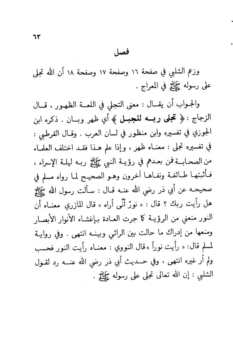 والجواب أن يقال: معنى التجلي في اللغة الظهور, قال الزجاج: {تجلى ربه للجبل} أي ظهر وبان. ذكره ابن الجوزي في تفسيره وابن منظور في لسان العرب. وقال القرطبي: في تفسيره تجلى: معناه ظهر, وإذا علم هذا فقد اختلف العلماء من الصحابة فمن بعدهم في رؤية النبي - صلى الله عليه وسلم - ربه ليلة الإسراء, فأثبتها طائفة ونفاها آخرون وهو الصحيح لما رواه مسلم في صحيحه عن أبي ذر رضي الله عنه قال: سألت رسول الله - صلى الله عليه وسلم - هل رأيت ربك؟ قال: «نورٌ أنَّى أراه» قال المازري معناه أن النور منعني من الرؤية كما جرت العادة بإغشاء الأنوار الأبصار ومنعها من إدراك ما حالت بين الرائي وبينه انتهى. وفي رواية لمسلم قال: «رأيت نوراً» قال النووي: معناه رأيت النور فحسب ولم أر غيره انتهى, وفي حديث أبي ذر رضي الله عنه رد لقول الشلبي: إن الله تعالى تجلي على رسوله - صلى الله عليه وسلم -.