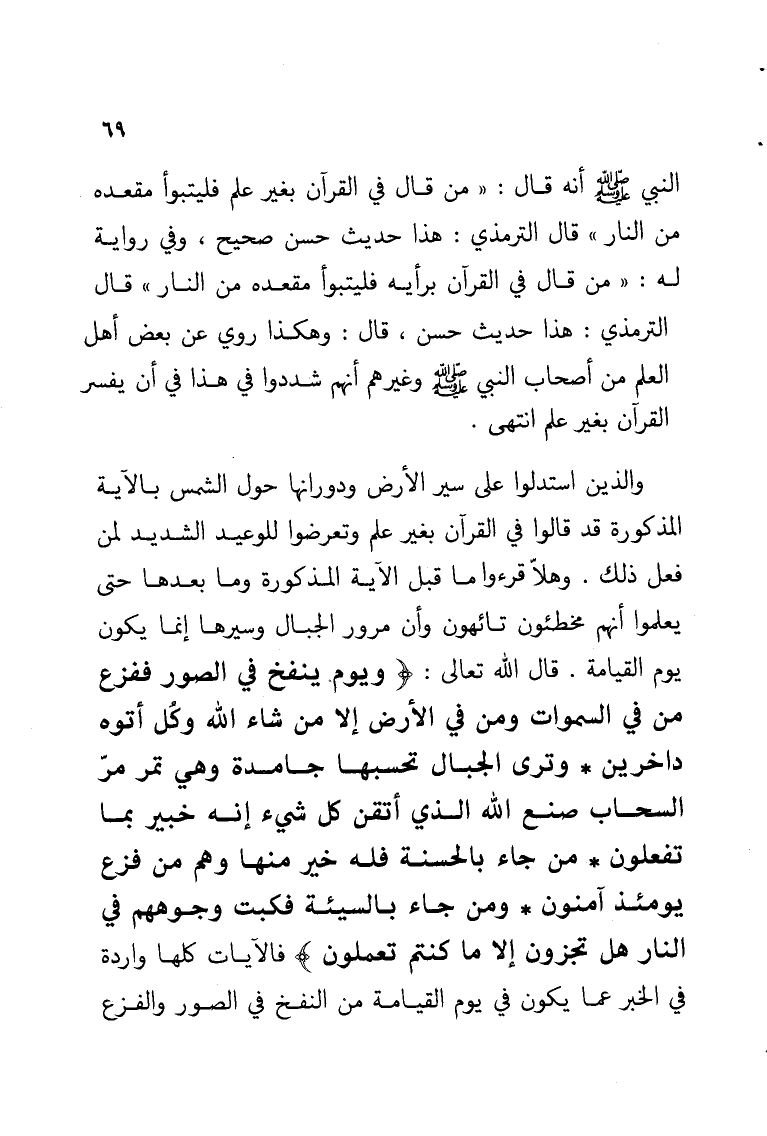 النبي - صلى الله عليه وسلم - أنه قال: «من قال في القرآن بغير علم فليتبوأ مقعده من النار» قال الترمذي: هذا حديث حسن صحيح, وفي رواية له: «من قال في القرآن برأيه فليتبوأ مقعده من النار» قال الترمذي: هذا حديث حسن, قال: وهكذا روي عن بعض أهل العلم من أصحاب النبي - صلى الله عليه وسلم - وغيرهم أنهم شددوا في هذا في أن يفسر القرآن بغير علم انتهى.