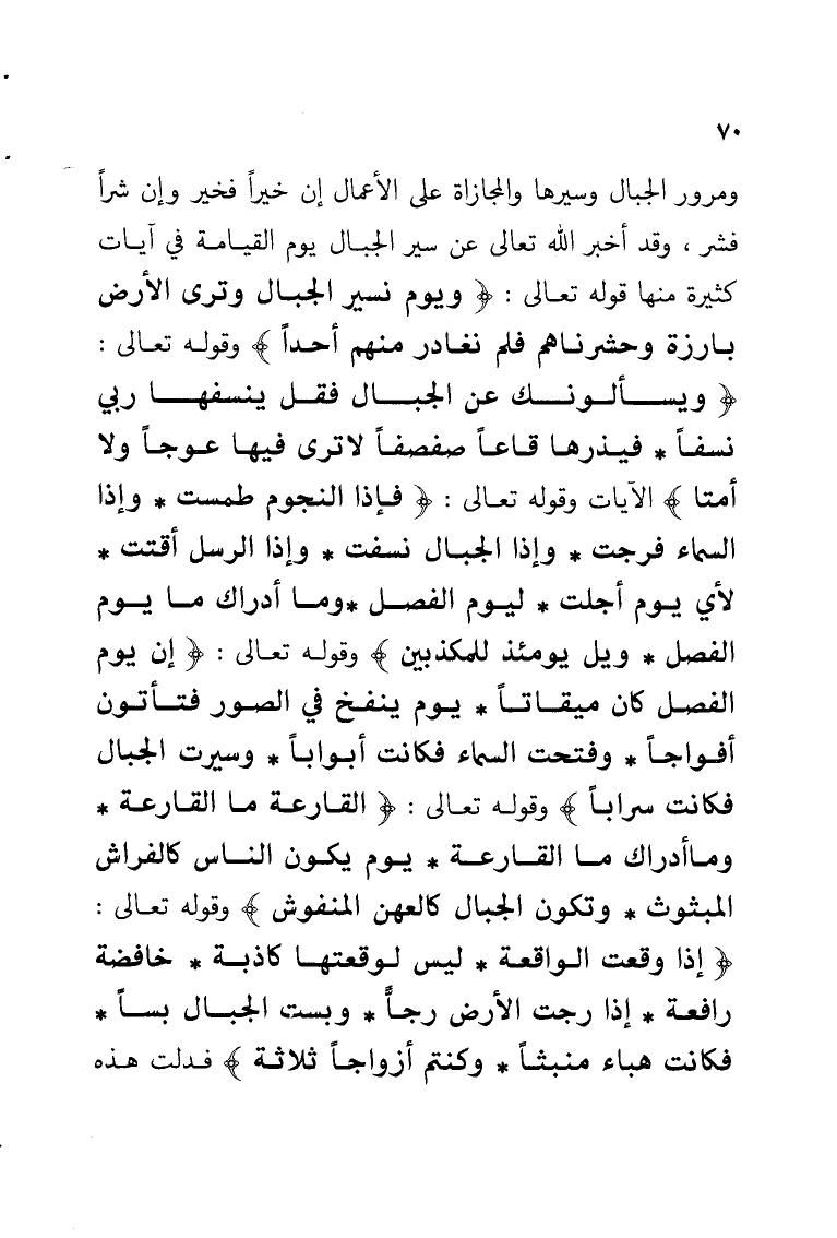 ومرور الجبال وسيرها والمجازاة على الأعمال إن خيراً فخير وإن شراً فشر, وقد أخبر الله تعالى عن سير الجبال يوم القيامة في آيات كثيرة منها قوله تعالى: {ويوم نسير الجبال وترى الأرض بارزة وحشرناهم فلم نغادر منهم أحداً} وقوله تعالى: {ويسألونك عن الجبال فقل ينسفها ربي نفساً * فيذرها قاعاً صفصفاً لا ترى فيها عوجاً ولا أمتا} الآيات وقوله تعالى: {فإذا النجوم طمست * وإذا السماء فرجت * وإذا الجبال نسفت * وإذا الرسل أقتت * لأي يوم أجلت * ليوم الفصل * وما أدراك ما يوم الفصل * ويل يومئذ للمكذبين} وقوله تعالى: {إن يوم الفصل كان ميقاتاً * يوم ينفخ في الصور فتأتون أفواجاً * وفتحت السماء فكانت أبواباً * وسيرت الجبال فكانت سراباً} وقوله تعالى: {القارعة ما القارعة * وما أدراك ما القارعة * يوم يكون الناس كالفراش المبثوث * وتكون الجبال كالعهن المنفوش} وقوله تعالى: {إذا وقعت الواقعة * ليس لوقعتها كاذبة * خافضة رافعة * إذا رجت الأرض رجاً * وبست الجبال بساً * فكانت هباء منبثاً * وكنتم أزواجاً ثلاثة} فدلت هذه