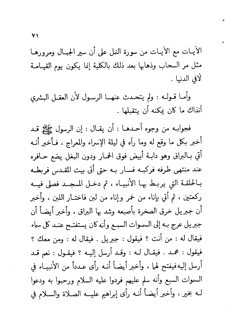 فجوابه من وجوه أحدها: أن يقال: إن الرسول - صلى الله عليه وسلم - قد أخبر بكل ما وقع له وما رآه في ليلة الإسراء والمعراج, فأخبر أنه أتي بالبراق وهو دابة أبيض فوق الحمار ودون البغل يضع حافره عند منتهى طرفه فركبه فسار به حتى أتى بيت المقدس فربطه بالحلقة التي يربط بها الأنبياء, ثم دخل المسجد فصلى فيه ركعتين, ثم أتي بإناء من خمر وإناء من لبن فاختار اللبن, وأخبر أن جبريل خرق الصخرة بأصبعه وشد بها البراق, وأخبر أيضاً أن جبريل عرج به إلى السموات السبع وأنه كان يستفتح عند كل سماء فيقال له: من أنت؟ فيقول: جبريل. فيقال له: ومن معك؟ فيقول: محمد.