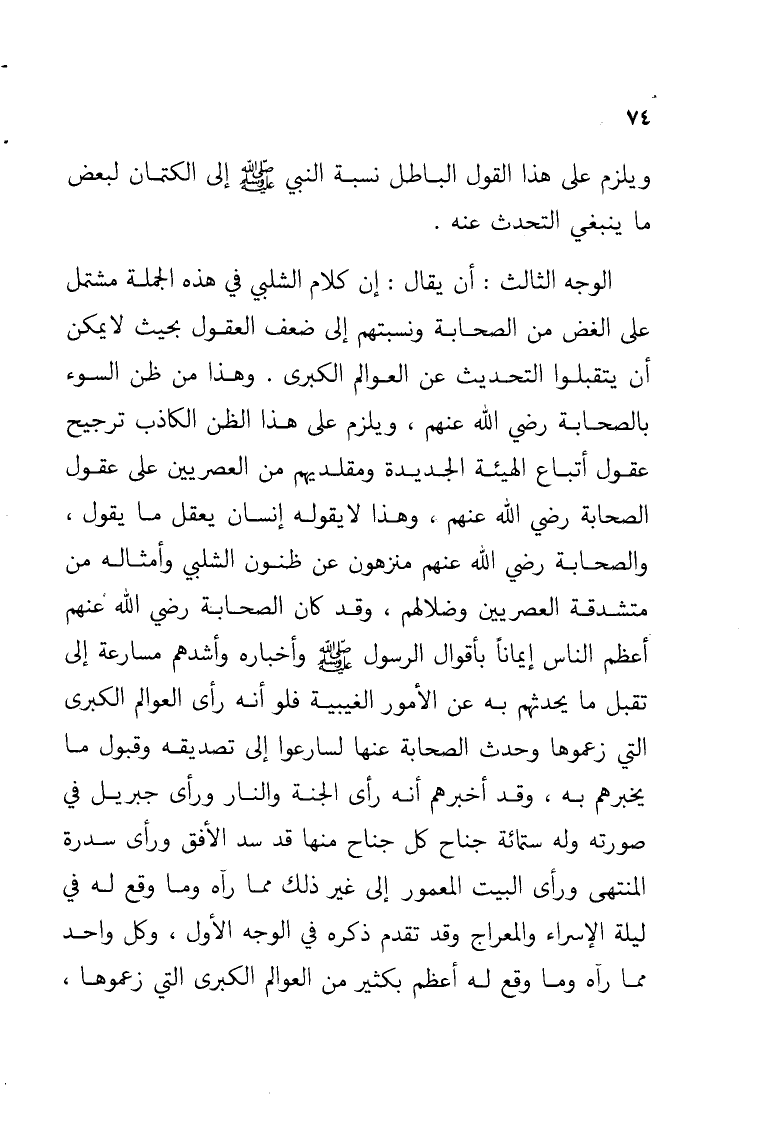 الوجه الثالث: أن يقال: إن كلام الشلبي في هذه الجملة مشتمل على الغض من الصحابة ونسبتهم إلى ضعف العقول بحيث لا يمكن أن يتقبلوا التحديث عن العوالم الكبرى. وهذا من ظن السوء بالصحابة رضي الله عنهم, ويلزم على هذا الظن الكاذب ترجيح عقول أتباع الهيئة الجديدة ومقلديهم من العصريين على عقول الصحابة رضي الله عنهم, وهذا لا يقوله إنسان يعقل ما يقول, والصحابة رضي الله عنهم منزهون عن ظنون الشلبي وأمثاله من متشدقة العصريين وضلالهم, وقد كان الصحابة رضي الله عنهم أعظم الناس إيماناً بأقوال الرسول - صلى الله عليه وسلم - وأخباره وأشدهم مسارعة إلى تقبل ما يحدثهم به عن الأمور الغيبية فلو أنه رأى العوالم الكبرى التي زعموها وحدث الصحابة عنها لسارعوا إلى تصديقه وقبول ما يخبرهم به, وقد أخبرهم أنه رأى الجنة والنار ورأى جبريل في صورته وله ستمائة جناح كل جناح منها قد سد الأفق ورأى سدرة المنتهى ورأى البيت المعمور إلى غير ذلك مما رآه وما وقع له في ليلة الإسراء والمعراج وقد تقدم ذكره في الوجه الأول, وكل واحد مما رآه وما وقع له أعظم بكثير من العوالم الكبرى التي زعموها,