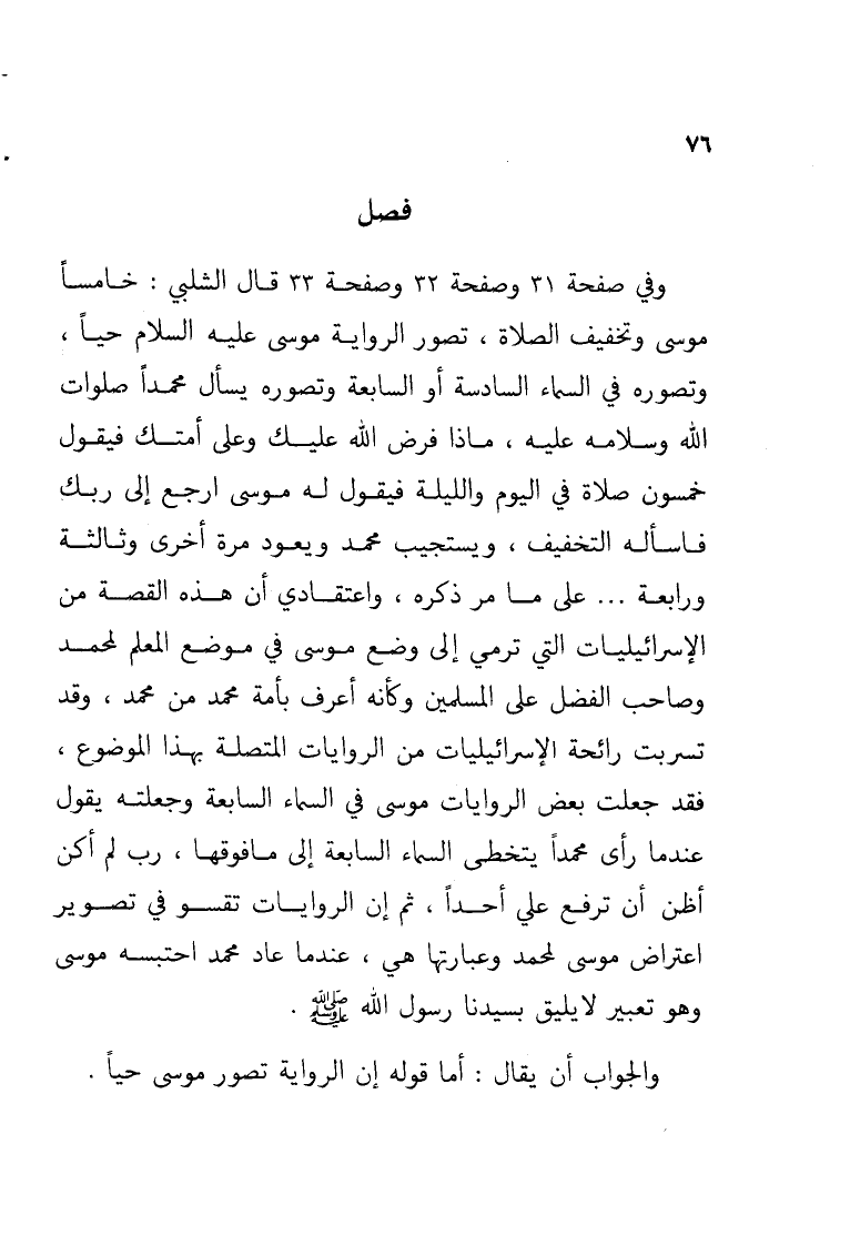 وفي صفحة 31 وصفحة 32 وصفحة 33 قال الشلبي: خامساً موسى وتخفيف الصلاة, تصور الرواية موسى عليه السلام حياً, وتصوره في السماء السادسة أو السابعة وتصوره يسأل محمداً صلوات الله وسلامه عليه, ماذا فرض الله عليك وعلى أمتك فيقول خمسون صلاة في اليوم والليلة فيقول له موسى ارجع إلى ربك فاسأله التخفيف, ويستجيب محمد ويعود مرة أخرى وثالثة ورابعة ... على ما مر ذكره, واعتقادي أن هذه القصة من الإسرائيليات التي ترمي إلى وضع موسى في موضع المعلم لمحمد وصاحب الفضل على المسلمين وكأنه أعرف بأمة محمد من محمد, وقد تسربت رائحة الإسرائيليات من الروايات المتصلة بهذا الموضوع, فقد جعلت بعض الروايات موسى في السماء السابعة وجعلته يقول عندما رأى محمداً يتخطى السماء السابعة إلى ما فوقها, رب لم أكن أظن أن ترفع علي أحداً, ثم إن الروايات تقسو في تصوير اعتراض موسى لمحمد وعبارتها هي, عندما عاد محمد احتبسه موسى وهو تعبير لا يليق بسيدنا رسول الله - صلى الله عليه وسلم -.
