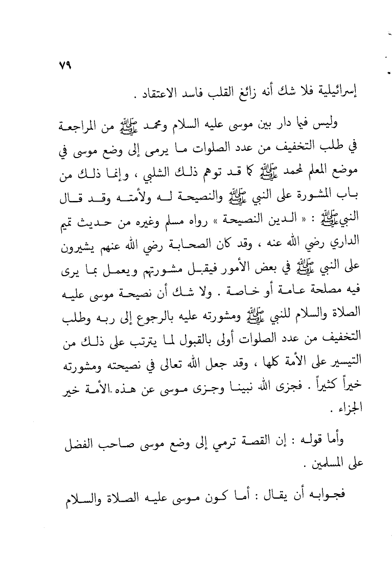 وليس فيما دار بين موسى عليه السلام ومحمد - صلى الله عليه وسلم - من المراجعة في طلب التخفيف من عدد الصلوات ما يرمى إلى وضع موسى في موضع المعلم لمحمد - صلى الله عليه وسلم - كما قد توهم ذلك الشلبي, وإنما ذلك من باب المشورة على النبي - صلى الله عليه وسلم - والنصيحة له ولأمته وقد قال النبي - صلى الله عليه وسلم -: «الدين النصيحة» رواه مسلم وغيره من حديث تميم الداري رضي الله عنه, وقد كان الصحابة رضي الله عنهم يشيرون على النبي - صلى الله عليه وسلم - في بعض الأمور فيقبل مشورتهم ويعمل بما يرى فيه مصلحة عامة أو خاصة. ولا شك أن نصيحة موسى عليه الصلاة والسلام للنبي - صلى الله عليه وسلم - ومشورته عليه بالرجوع إلى ربه وطلب التخفيف من عدد الصلوات أولى بالقبول لما يترتب على ذلك من التيسير على الأمة كلها, وقد جعل الله تعالى في نصيحته ومشورته خيراً كثيراً. فجزى الله نبينا وجزى موسى عن هذه الأمة خير الجزاء.