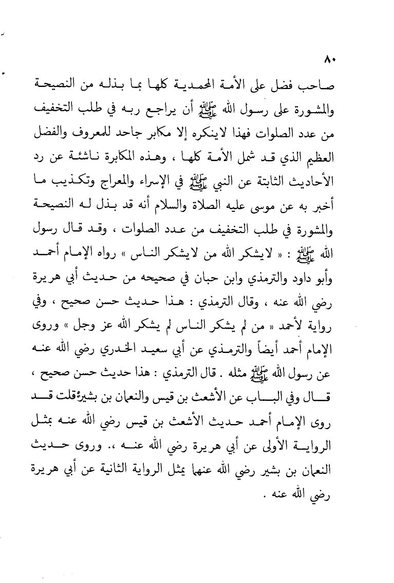 صاحب فضل على الأمة المحمدية كلها بما بذله من النصيحة والمشورة على رسول الله - صلى الله عليه وسلم - أن يراجع ربه في طلب التخفيف من عدد الصلوات فهذا لا ينكره إلا مكابر جاحد للمعروف والفضل العظيم الذي قد شمل الأمة كلها, وهذه المكابرة ناشئة عن رد الأحاديث الثابتة عن النبي - صلى الله عليه وسلم - في الإسراء والمعراج وتكذيب ما أخبر به عن موسى عليه الصلاة والسلام أنه قد بذل له النصيحة والمشورة في طلب التخفيف من عدد الصلوات, وقد قال رسول الله - صلى الله عليه وسلم -: «لا يشكر الله من لا يشكر الناس» رواه الإمام أحمد وأبو داود والترمذي وابن حبان في صحيحه من حديث أبي هريرة رضي الله عنه, وقال الترمذي: هذا حديث حسن صحيح, وفي رواية لأحمد «من لم يشكر الناس لم يشكر الله عز وجل» وروى الإمام أحمد أيضاً والترمذي عن أبي سعيد الخدري رضي الله عنه عن رسول الله - صلى الله عليه وسلم - مثله. قال الترمذي: هذا حديث حسن صحيح, قال وفي الباب عن الأشعث بن قيس والنعمان بن بشير: قلت قد روى الإمام أحمد حديث الأشعث بن قيس رضي الله عنه بمثل الرواية الأولى عن أبي هريرة رضي الله عنه, وروى حديث النعمان بن بشير رضي الله عنهما بمثل الرواية الثانية عن أبي هريرة رضي الله عنه.