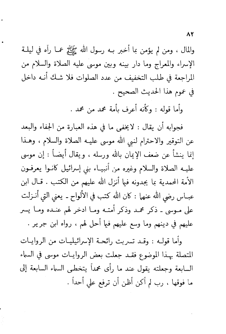 والمال, ومن لم يؤمن بما أخبر به رسول الله - صلى الله عليه وسلم - عما رآه في ليلة الإسراء والمعراج وما دار بينه وبين موسى عليه الصلاة والسلام من المراجعة في طلب التخفيف من عدد الصلوات فلا شك أنه داخل في عموم هذا الحديث الصحيح.