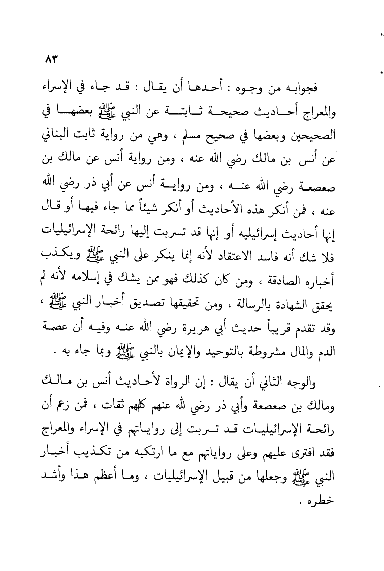 فجوابه من وجوه: أحدها أن يقال: قد جاء في الإسراء والمعراج أحاديث صحيحة ثابتة عن النبي - صلى الله عليه وسلم - بعضها في الصحيحين وبعضها في صحيح مسلم, وهي من رواية ثابت البناني عن أنس بن مالك رضي الله عنه, ومن رواية أنس عن مالك بن صعصعة رضي الله عنه, ومن رواية أنس عن أبي ذر رضي الله عنه, فمن أنكر هذه الأحاديث أو أنكر شيئاً مما جاء فيها أو قال إنها أحاديث إسرائيلية أو إنها قد تسربت إليها رائحة الإسرائيليات فلا شك أنه فاسد الاعتقاد لأنه إنما ينكر على النبي - صلى الله عليه وسلم - ويكذب أخباره الصادقة, ومن كان كذلك فهو ممن يشك في إسلامه لأنه لم يحقق الشهادة بالرسالة, ومن تحقيقها تصديق أخبار النبي - صلى الله عليه وسلم - , وقد تقدم قريباً حديث أبي هريرة رضي الله عنه وفيه أن عصمة الدم والمال مشروطة بالتوحيد والإيمان بالنبي - صلى الله عليه وسلم - وبما جاء به.