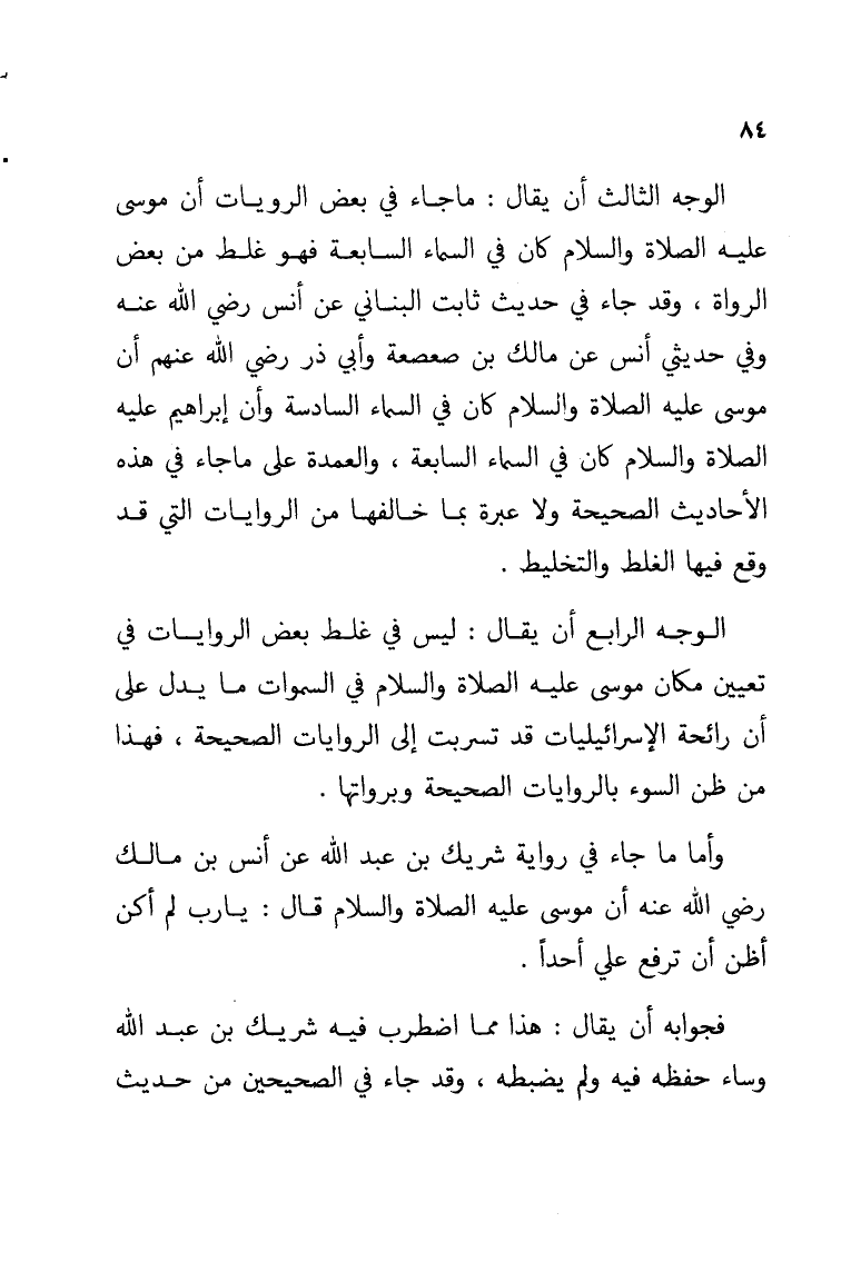 الوجه الثالث أن يقال: ما جاء في بعض الروايات أن موسى عليه الصلاة والسلام كان في السماء السابعة فهو غلط من بعض الرواة, وقد جاء في حديث ثابت البناني عن أنس رضي الله عنه وفي حديثي أنس عن مالك بن صعصعة وأبي ذر رضي الله عنهم أن موسى عليه الصلاة والسلام كان في السماء السادسة وأن إبراهيم عليه الصلاة والسلام كان في السماء السابعة, والعمدة على ما جاء في هذه الأحاديث الصحيحة ولا عبرة بما خالفها من الروايات التي قد وقع فيها الغلط والتخليط.