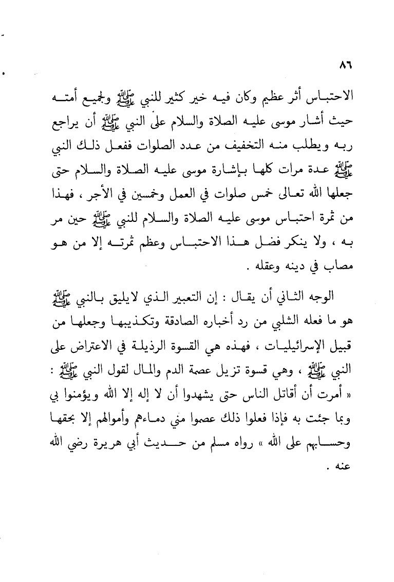الوجه الثاني أن يقال: إن التعبير الذي لا يليق بالنبي - صلى الله عليه وسلم - هو ما فعله الشلبي من رد أخباره الصادقة وتكذيبها وجعلها من قبيل الإسرائيليات, فهذه هي القسوة الرذيلة في الاعتراض على النبي - صلى الله عليه وسلم - , وهي قسوة تزيل عصمة الدم والمال لقول النبي - صلى الله عليه وسلم -: «أمرت أن أقاتل الناس حتى يشهدوا أن لا إله إلا الله ويؤمنوا بي وبما جئت به فإذا فعلوا ذلك عصموا مني دماءهم وأموالهم إلا بحقها وحسابهم على الله» رواه مسلم من حديث أبي هريرة رضي الله عنه.