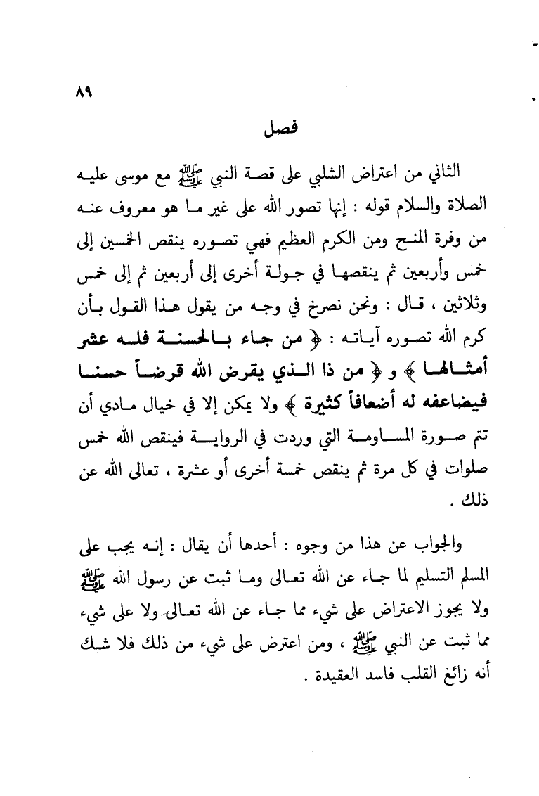 الثاني من اعتراض الشلبي على قصة النبي - صلى الله عليه وسلم - مع موسى عليه الصلاة والسلام قوله: إنها تصور الله على غير ما هو معروف عنه من وفرة المنح ومن الكرم العظيم فهي تصوره ينقص الخمسين إلى خمس وأربعين ثم ينقصها في جولة أخرى إلى أربعين ثم إلى خمس وثلاثين, قال: ونحن نصرخ في وجه من يقول هذا القول بأن كرم الله تصوره آياته: {من جاء بالحسنة فله عشر أمثالها} و {من ذا الذي يقرض الله قرضاً حسنا فيضاعفه له أضعافاً كثيرة} ولا يمكن إلا في خيال مادي أن تتم صورة المساومة التي وردت في الرواية فينقص الله خمس صلوات في كل مرة ثم ينقص خمسة أخرى أو عشرة, تعالى الله عن ذلك.