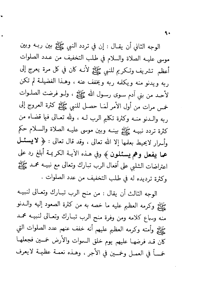 الوجه الثاني أن يقال: إن في تردد النبي - صلى الله عليه وسلم - بين ربه وبين موسى عليه الصلاة والسلام في طلب التخفيف من عدد الصلوات أعظم تشريف وتكريم للنبي - صلى الله عليه وسلم - لأنه كان في كل مرة يعرج إلى ربه ويدنو منه ويكلمه ربه ويخفف عنه, وهذا الفضيلة لم تكن لأحد من بني آدم سوى رسول الله - صلى الله عليه وسلم - , ولو فرضت الصلوات خمس مرات من أول الأمر لَمَا حصل للنبي - صلى الله عليه وسلم - كثرة العروج إلى ربه والدنو منه وكثرة تكليم الرب له, ولله تعالى فيما قضاه من كثرة تردد نبيه - صلى الله عليه وسلم - بينه وبين موسى عليه الصلاة والسلام حكم وأسرار لا يحيط بعلمها إلا الله تعالى, وقد قال تعالى: {لا يسئل عما يفعل وهم يسئلون} وفي هذه الآية الكريمة أبلغ رد على اعتراضات الشلبي على أفعال الرب تبارك وتعالى مع نبيه محمد - صلى الله عليه وسلم - وكثرة ترديده له في طلب التخفيف من عدد الصلوات.