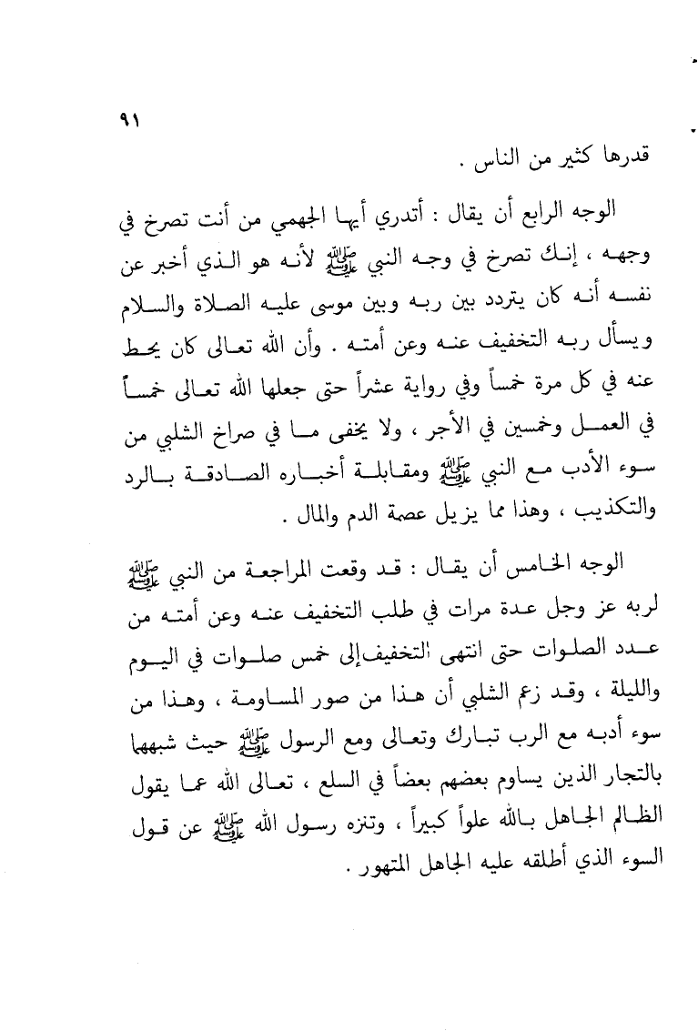 الوجه الرابع أن يقال: أتدري أيها الجهمي من أنت تصرخ في وجهه, إنك تصرخ في وجه النبي - صلى الله عليه وسلم - لأنه هو الذي أخبر عن نفسه أنه كان يتردد بين ربه وبين موسى عليه الصلاة والسلام ويسأل ربه التخفيف عنه وعن أمته. وأن الله تعالى كان يحط عنه في كل مرة خمساً وفي رواية عشراً حتى جعلها الله تعالى خمساً في العمل وخمسين في الأجر, ولا يخفى ما في صراخ الشلبي من سوء الأدب مع النبي - صلى الله عليه وسلم - ومقابلة أخباره الصادقة بالرد والتكذيب, وهذا مما يزيل عصمة الدم والمال.