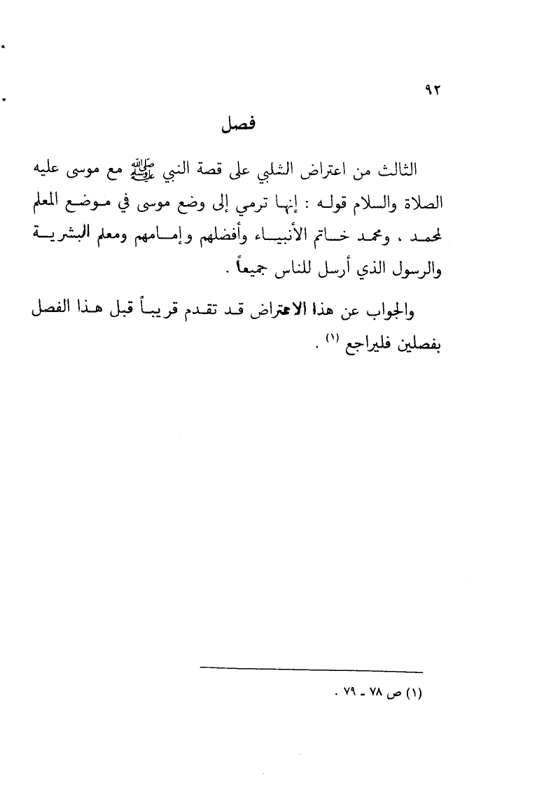 الثالث من اعتراض الشلبي على قصة النبي - صلى الله عليه وسلم - مع موسى عليه الصلاة والسلام قوله: إنها ترمي إلى وضع موسى في موضع المعلم لمحمد, ومحمد خاتم الأنبياء وأفضلهم وإمامهم ومعلم البشرية والرسول الذي أرسل للناس جميعاً.