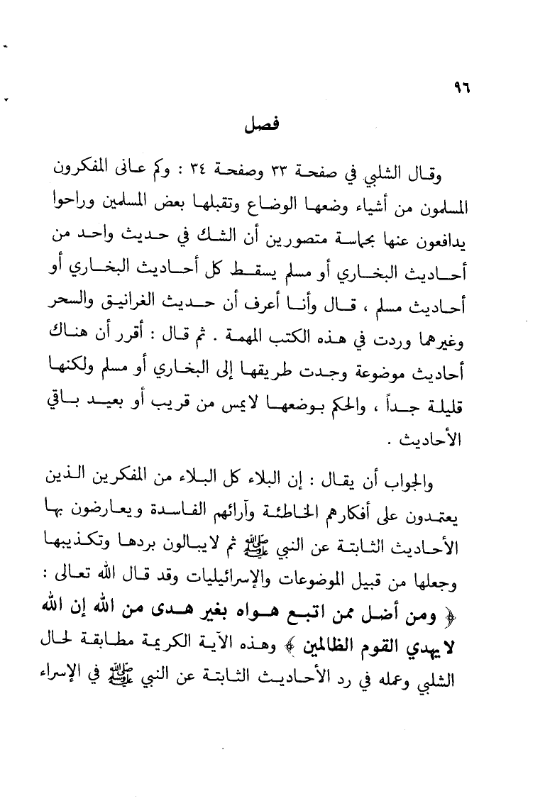 والجواب أن يقال: إن البلاء كل البلاء من المفكرين الذين يعتمدون على أفكارهم الخاطئة وآرائهم الفاسدة ويعارضون بها الأحاديث الثابتة عن النبي - صلى الله عليه وسلم - ثم لا يبالون بردها وتكذيبها وجعلها من قبيل الموضوعات والإسرائيليات وقد قال الله تعالى: {ومن أضل ممن اتبع هواه بغير هدى من الله إن الله لا يهدي القوم الظالمين} وهذه الآية الكريمة مطابقة لحال الشلبي وعمله في رد الأحاديث الثابتة عن النبي - صلى الله عليه وسلم - في الإسراء