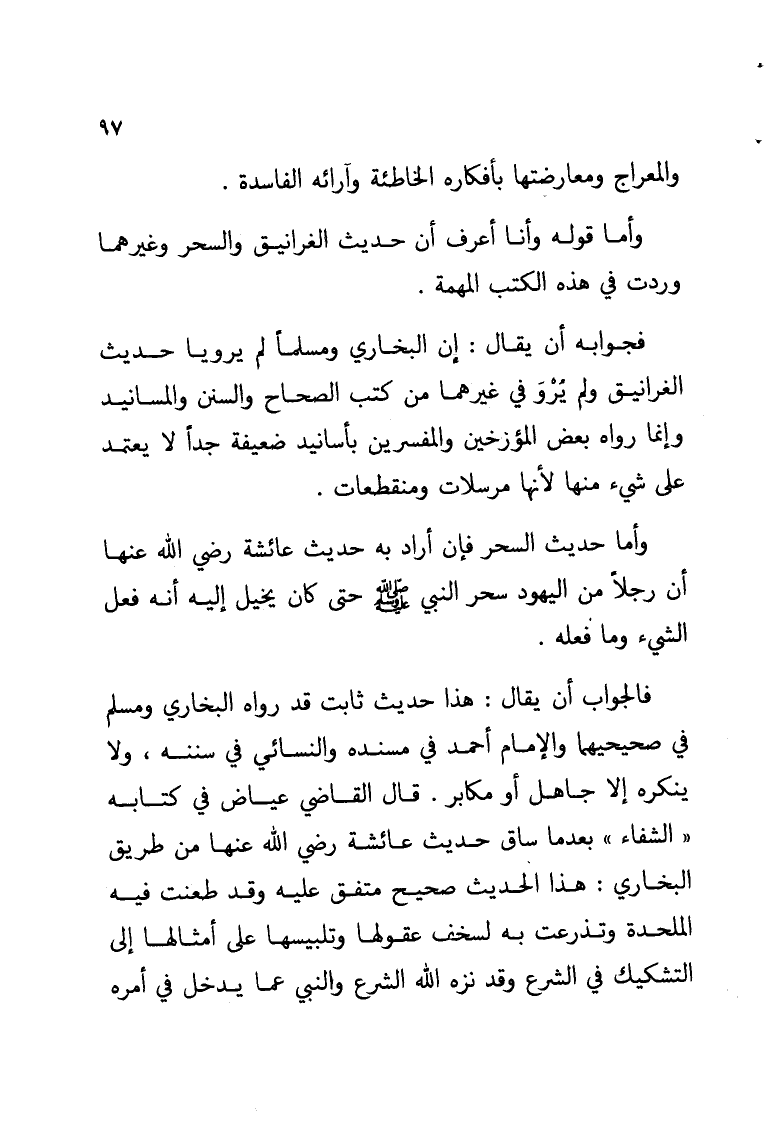 فالجواب أن يقال: هذا حديث ثابت قد رواه البخاري ومسلم في صحيحيهما والإمام أحمد في مسنده والنسائي في سننه, ولا ينكره إلا جاهل أو مكابر. قال القاضي عياض في كتابه «الشفاء» بعدما ساق حديث عائشة رضي الله عنها من طريق البخاري: هذا الحديث صحيح متفق عليه وقد طعنت فيه الملحدة وتذرعت به لسخف عقولها وتلبيسها على أمثالها إلى التشكيك في الشرع وقد نزه الله الشرع والنبي عما يدخل في أمره