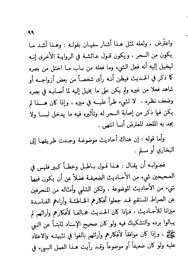 فجوابه أن يقال: هذا قول باطل وخطأ كبير فليس في الصحيحين شيء من الأحاديث الضعيفة فضلاً عن أن يكون فيهما شيء من الأحاديث الموضوعة, ولكن الشلبي وأمثاله من المنحرفين عن الصراط المستقيم قد جعلوا أفكارهم الخاطئة وآراءهم الفاسدة ميزاناً للأحاديث، فإذا كان الحديث مخالفاً لأفكارهم وآرائهم لم يبالوا برده والتشكيك فيه ولو كان صحيح الإسناد ثابتاً عن النبي - صلى الله عليه وسلم - , وإذا كان موافقاً لأفكارهم وآرائهم بالغوا في تثبيته والاعتماد عليه ولو كان ضعيفاً أو موضوعاً وقد رأيت هذا العمل السيئ في