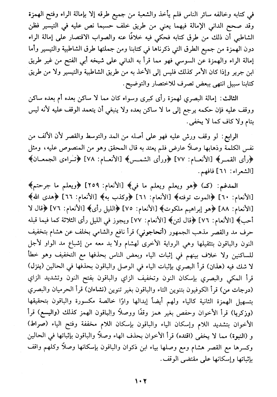 184 - الدَّاعِ إِذا دَعانِ قرأ ورش والبصري بإثبات الياء في الداع ودعان في الوصل دون الوقف، واختلف عن قالون في إثباتها في الوصل فقطع له بالحذف جمهور المغاربة وبعض العراقيين وهو الذي في التيسير، والكافي، والهادي، والهداية، والتبصرة، وغيرها، وقطع له بالإثبات الإمامان الكبيران: أبو محمد عبد الله بن علي سبط الخياط في منهجه، وأبو العلاء الهمداني في غايته وغيرهما. قال المحقق. والوجهان صحيحان إلا أن الحذف أكثر وأشهر.