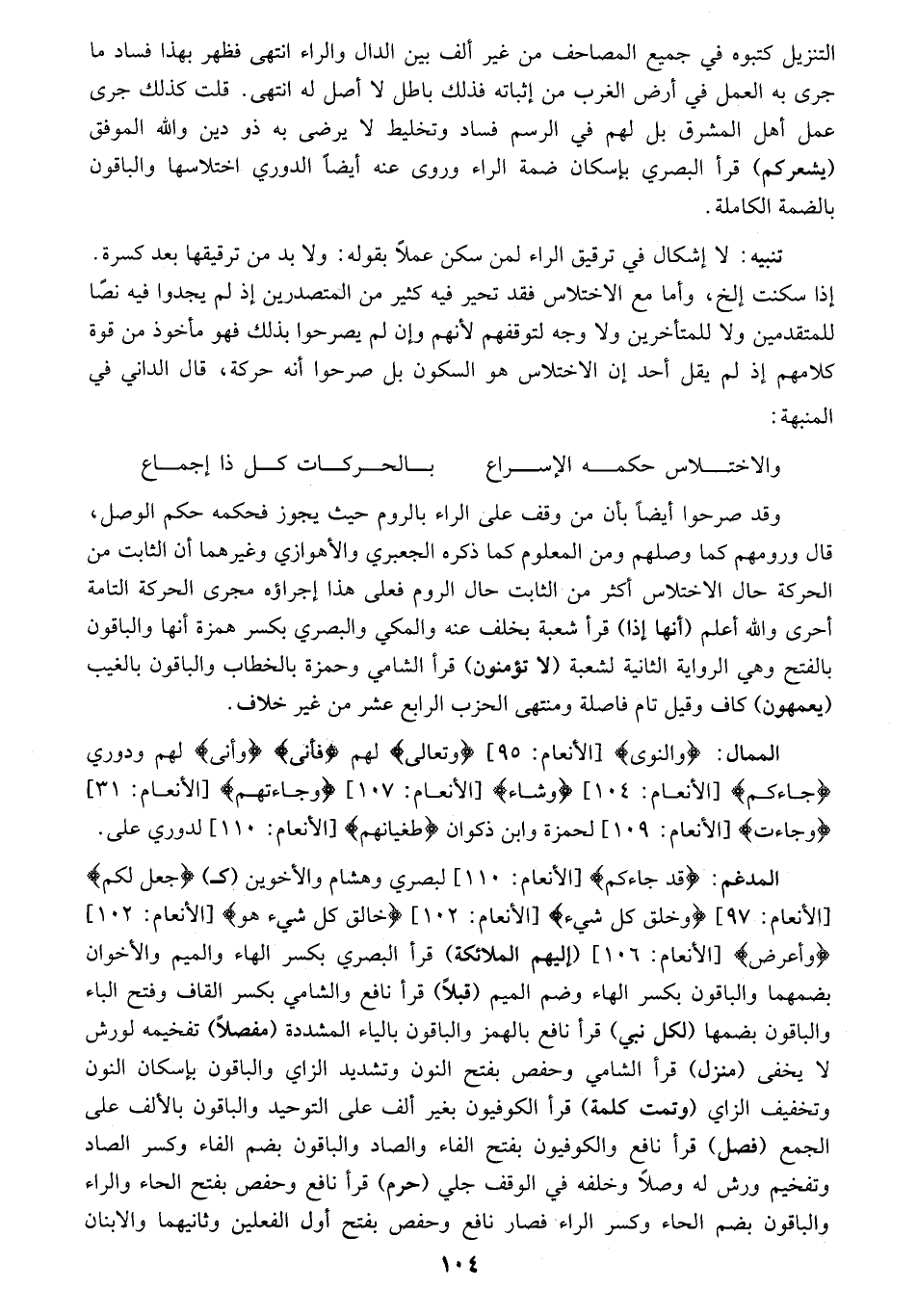 وهو مذهب جماعة كثيرة من المتأخرين، وأبعد قوم فقالوا فيه بالإظهار، وهم إن ثبت لهم بغير الإدغام المحض رواية فمسلم، وإن تركوه فرارا من الوقوع في الجمع بين الساكنين على غير حده؛ لأن ذلك لا يجوز في العربية وهو المأخوذ من كلامهم لتعليلهم به فغير صحيح لأن هذا الأصل مختلف فيه فالمشهور عندهم أن حد اجتماع الساكنين أن يكون الأول حرف مد ولين، والثاني مدغم فيه نحو فِيهِ هُدىً*، وَلا تَيَمَّمُوا على رواية البزي، لأن حرف المد واللين، وإن كان ساكنا فإنه في حكم المتحرك لأن ما فيه من المد قائم مقام الحركة ومنهم من جعله كون الثاني مدغما فيه نحو شهر رمضان وهل تربصون، ومنهم من قال أن يكون الأول حرف مد ولين نحو محياي في قراءة الإسكان ولو سلّم أن النحويين اتفقوا على الأول لم يمنعنا ذلك من القراءة بالإدغام المحض، لأن القراءة لا تتبع العربية بل العربية تتبع القراءة لأنها مسموعة من أفصح العرب بإجماع وهو نبينا- صلى الله عليه وسلّم- ومن أصحابه ومن بعدهم إلى أن فسدت الألسن بكثرة المولدين، وهم أيضا من أفصح العرب، وقد قال ابن الحاجب ما معناه: إذا اختلف النحويون والقراء كأن المصير إلى القراء أولى لأنهم ناقلون عمن ثبتت عصمته من الغلط، ولأن القراءة ثبتت تواترا وما نقله النحويون فآحاد، ثم لو سلّم أن ذلك ليس بمتواتر فالقراء أعدل وأكثر فالرجوع إليهم أولى وأيضا فلا ينعقد إجماع النحويين بدونهم لأنهم شاركوهم في نقل اللغة، وكثير منهم من النحويين.