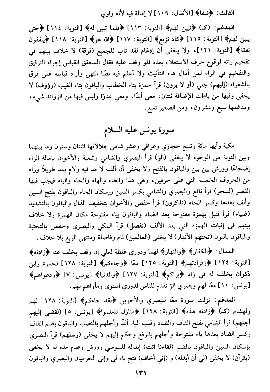 وزيدها إيضاحا ببيان كيفية قراءتها فأقول: تبدأ أولا بقالون بإظهار واغفر لنا وقصر المنفصل وفتح مولانا والكافرين مع الطويل فيه، وفي الرحيم والقيوم مع زيادة الإشمام والروم فيه، ولا يكون إلا مع القصر ثلاثة أوجه مع قصر الم اللَّهُ، ثم الثلاثة في القيوم مع مده، وإنما قدمنا القصر لأن ابن غلبون في التذكرة رجحه، ولم يقرأ بسواه من أجل أن الساكن ذهب بالحركة ثم تأتي بروم الرحيم مع قصر الم الله مع ثلاثة القيوم، ثم يمده معها، ثم وصل البسملة بأول السورة مع وجهي الم الله مع ثلاثة القيوم عليهما، ثم تأتي بالتوسط في الكافرين، ثم بالقصر، ويأتي عليهما ما أتى على الطويل، ثم تصل آخر السورة بالبسملة وهي أول السورة مع قصر الم الله، ومده وسبعة القيوم عليهما، ويندرج معه المكي في جميعها، واندرج معه الدوري على الإظهار وقصر المنفصل، أو تخلف في إمالة الكافرين فتعطفه عليه بالإمالة مع عدم البسملة فتبدأ بالسكت على الكافرين مع الطويل فيه وقصر الم الله، وثلاثة القيوم، ثم مع مده كذلك ثم بالتوسط في الكافرين، ثم القصر فيه مع ثلاثة القيوم معهما ثم وصل السورة بالسورة مع وجهي الم الله مع سبعة القيوم معهما ثم مع البسملة كقالون ثم تأتي بمد المنفصل لقالون، ويأتي عليه ما أتى القصر، ويندرج معه الشامي على البسملة، وعاصم إن كنت تقرأ بمرتبتين وهو المعول عليه عندنا كما تقدم، ويندرج معه الدوري أيضا إلا أنه تخلف في إمالة الكافرين فتأتي به منه بترك البسملة مع السكت، والوصل، ثم مع البسملة كما تقدم، ثم تأتي بالشامي بفتح الكافرين مع ترك