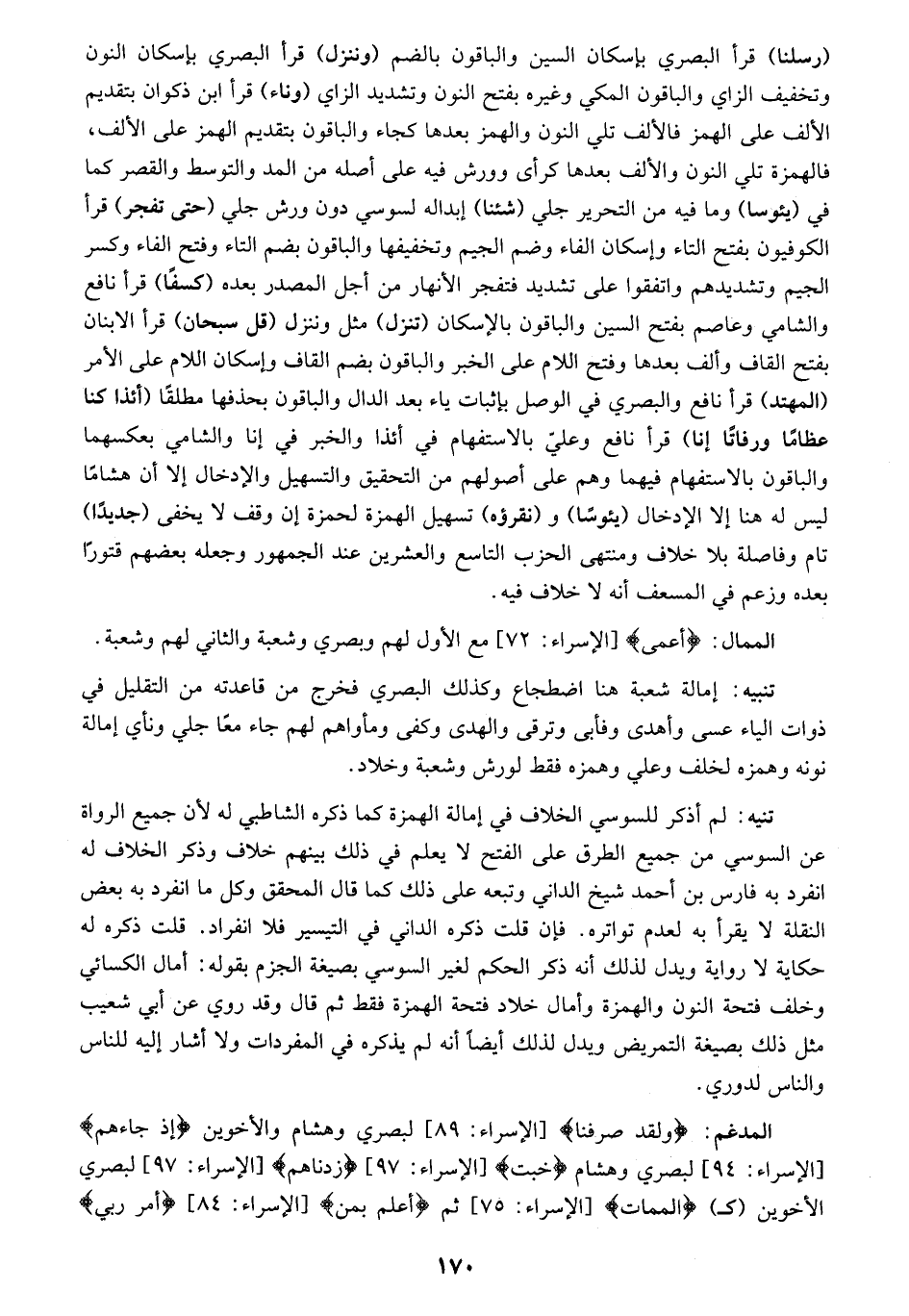 37 - وَبِالْوالِدَيْنِ* إلى أَيْمانُكُمْ* كيفية قراءتها لورش أن تأتي بالفتح في القربى واليتامى مع الإمالة في الجار، ثم تعطف فتح والجار، ثم تأتي بالتقليل في القربى واليتامى مع الإمالة في الجار، ثم تعطف فتحه فإن وصلت هذا ب شَيْئاً* قبله فتأتي ثمانية أوجه، أربعة على التوسط في شيئان وأربعة على الطويل فيه، وإنما قدمت الإمالة في الجار على الفتح وإن كان صنيع الناس عكسه؛ لأن التقليل أشهر كما قال الداني في التيسير، وبه قرأت، وبه نأخذ، وقطع به في المفردات، ولم يذكر سواه، وهو الجاري على أصل الأزرق.