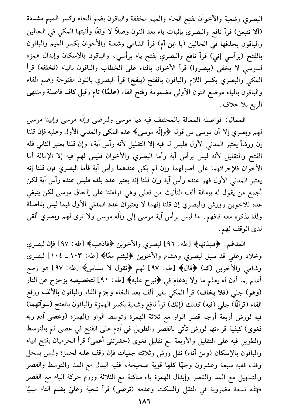 وبينها وبين آخر سورة النساء من قوله تعالى: وَاللَّهُ بِكُلِّ شَيْءٍ عَلِيمٌ* إلى قوله تعالى: بِالْعُقُودِ على ما يقتضيه الضرب ألف وجه وثلاثمائة وستة عشر وجها، بيانها لقالون: مائتان وثمانون، وبيانها تضرب في سبعة عليم خمسة الرحيم خمسة وثلاثون تضرب فيها أربعة بالعقود مائة وأربعون، وعلى وصل الجميع أربعة بالعقود تضيفها لها لمجموع مائة وأربعة وأربعون تضربها في وجهي المنفصل بلغ العدد ما ذكر، ولورش ألف وجه وستة وخمسون، بيانها تضرب ما لقالون في ثلاثة آمنوا ثمانمائة وأربعة وستون وجها شيء كوجهي المنفصل لقالون، هذا على البسملة، ويأتي على تركها مائة واثنان وتسعون ومائة وثمانية وستون على السكت وأربعة وعشرون على الوصل، واجمع العدد بعضه إلى بعض تجد ما ذكر. وللمكي: مائة وأربعة وأربعون وجها كقالون إذا قصر.