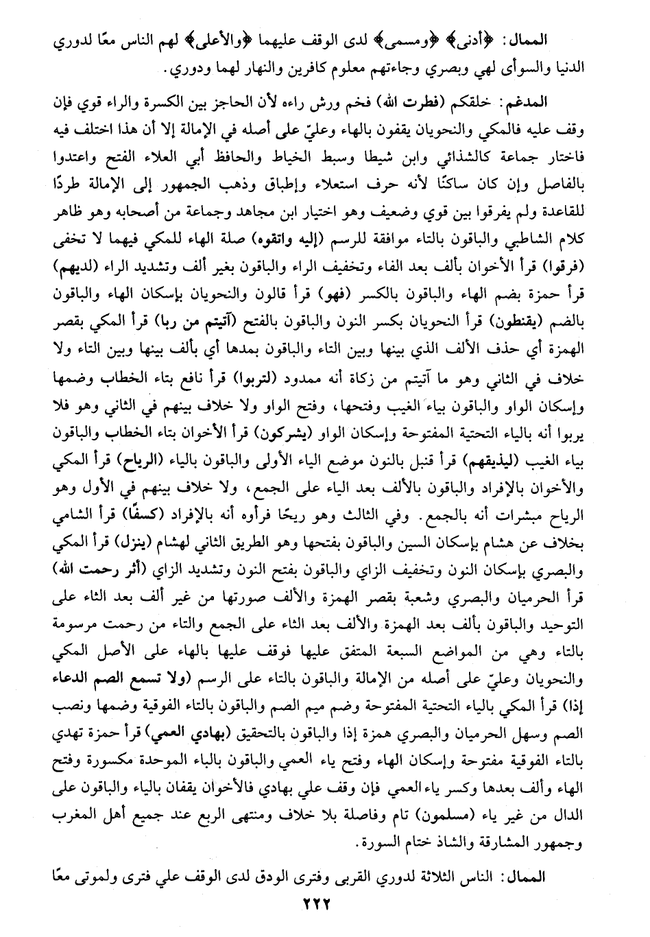 97 - يَذَّكَّرُونَ* كاف وقيل تام وفاصلة بلا خلاف، ومنتهى الربع عند أهل الغرب ويعملون بعده عند أهل المشرق، وحكى بعضهم الإجماع عليه فإن عنى إجماعهم فمسلم وإن عنى إجماع الناس فقصور.