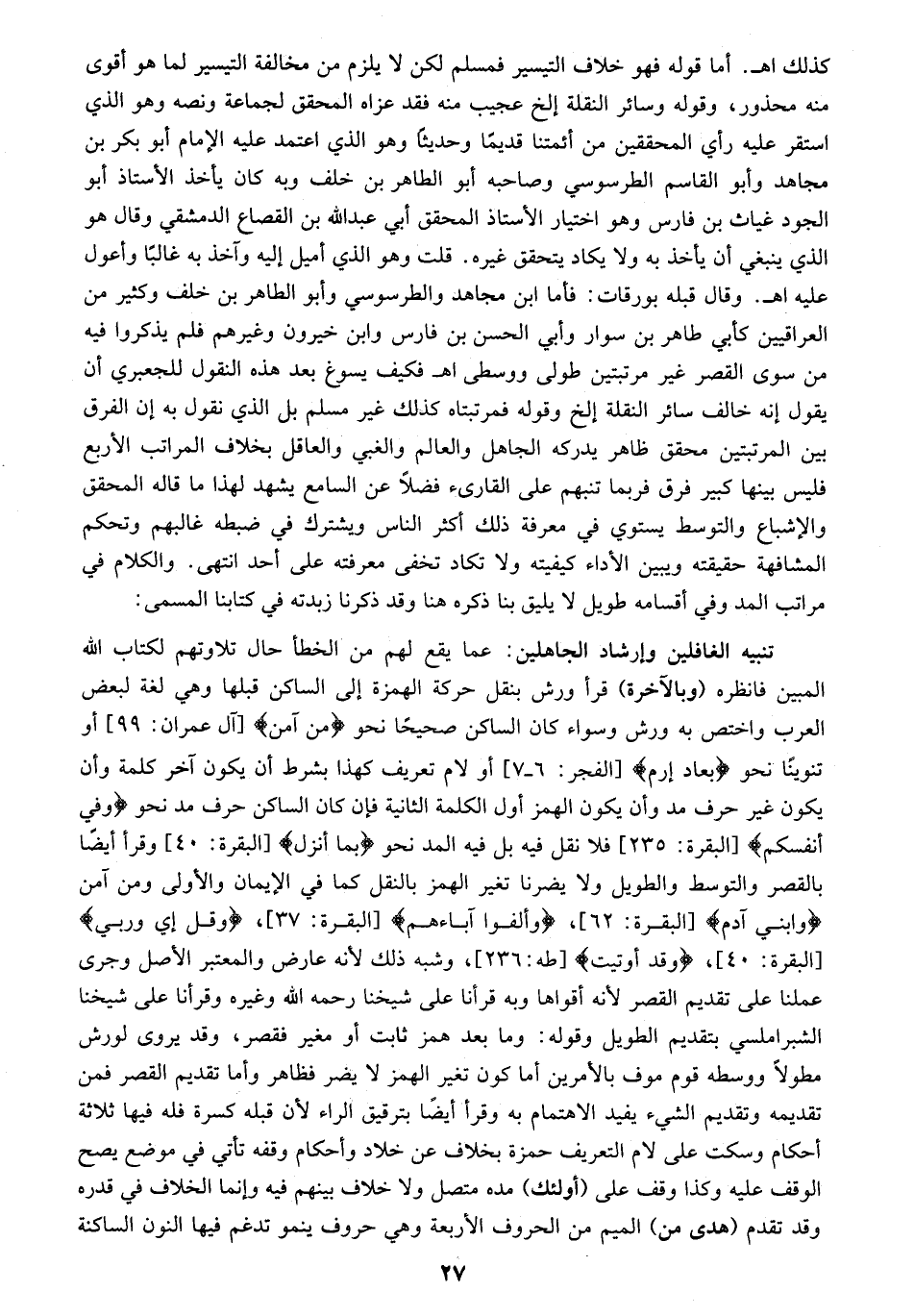 فإمالته بين بين، ومن خرج منهم عن هذا الأصل أبينه في موضعه إن شاء الله تعالى، وأذكر للكسائي ما يصح الوقف عليه من هاء التأنيث إلا ما هو ظاهر فاحذفه وإنما اقتصر على ما يصح الوقف عليه في هذا الباب وباب وقف حمزة وهشام لأن بمعرفته يعرف حكم غيره وفيه استدعاء لتعلم ما أهمل تعلمه وهو معرفة ما يوقف عليه وما يبتدأ به وهو أمر واجب ويؤدي تركه إلى الإخلال بالفهم وفساد المعنى وأي فساد أعظم من هذا، ولهذا حض العلماء قديما وحديثا عليه وألفوا فيه التآليف المطولة والمختصرة، وحكوا فيها عن الصحابة ومن بعدهم آثارا كثيرة منها قول ابن مسعود- رضي الله عنه-: «الوقف منازل القرآن»، وقول على- رضي الله عنه-: «الترتيل معرفة الوقف وتجويد الحروف»، وقول ابن عمر- رضي الله عنهما-: «لقد غشينا برهة من دهرنا وإن أحدنا ليؤتى الإيمان قبل القرآن وتنزل السورة على النبي- صلى الله عليه