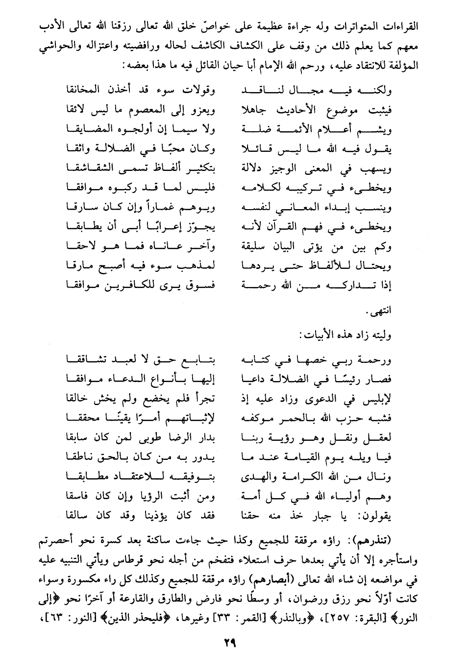 فصول: إذ، وقد، وتاء التأنيث، وهل، وبل، وحروف قربت مخارجها، وأما الواجب المتفق عليه فإن كان غير مرسوم نحو جنّة وإياك ودابة ونكفر وكلا فلا أتعرض له بذكر ولا عدد لكثرته، ووضوحه، وأما ما كان مرسوما نحو يدرككم وقد تبين، وقد دخلوا، وإذ ذهب، وإذ ظلموا، وطلعت تزاور، وأثقلت دعوا الله، وقالت طائفة، وقل ربي، وهل لك فربما أذكره مع عزوه للجميع خوفا من إظهاره اغترارا برسمه، ولا أتعرض لعدده خوف اللبس بغيره، وإذا قلت في العدد مكي أعني بذلك علماء مكة كابن كثير ومجاهد، ومدني علماء المدينة كيزيد ونافع وشيبة وإسماعيل فإن وافق يزيد أصحابه فمدني أول، وإن انفردوا عنه فمدني آخر وبصري كعاصم الجحدري وشامي كابن عامر والذماري وشريح وكوفي كعبد الله بن حبيب السلمي وعاصم وحمزة والكسائي، فإذا اتفق المكي والمدني أقول حرمي والبصري والكوفي أقول عراقي، وإذا خالف شريح صاحبيه أقول دمشقي، وإذا انفرد عنهما أقول حمصي، وأعني بالحرميين إمامي طيبة ومكة أبو رويم نافعا وأبا معبد عبيد الله بن كثير، وبالابنين ابن كثير وعبد الله بن عامر الشامي، وبالأخوين أبا عمارة حمزة بن حبيب وأبا الحسن على بن حمزة الكسائي، وإذا انفرد أقول عليّ وهو البصري النحويان، والأخوان، وعاصم، الكوفيون وإذا أطلقت الدوري فأعني به من روايته عن أبي عمرو، وإن كان من روايته عن الكسائي أقيده بقولي دوري عليّ، إلا إذا كان معطوفا على البصري فلا أقيده إذ لا لبس، وإذا ذكرت ضمير المفرد الغائب بارزا كان كقوله وكلامه وهو أول مستترا كذكر وقال فأريد به الشيخ الصالح العلامة أبا القاسم أو أبا محمد القاسم بن فيرة بكسر الفاء وسكون الياء الممدودة وتشديد الراء المضمومة بلغة أعاجم الأندلس ومعناه بالعربي الحديد بالحاء المهملة ابن خلف بن أحمد الرعيني الشاطبي، وربما أصرح به عند خوف اللبس.
