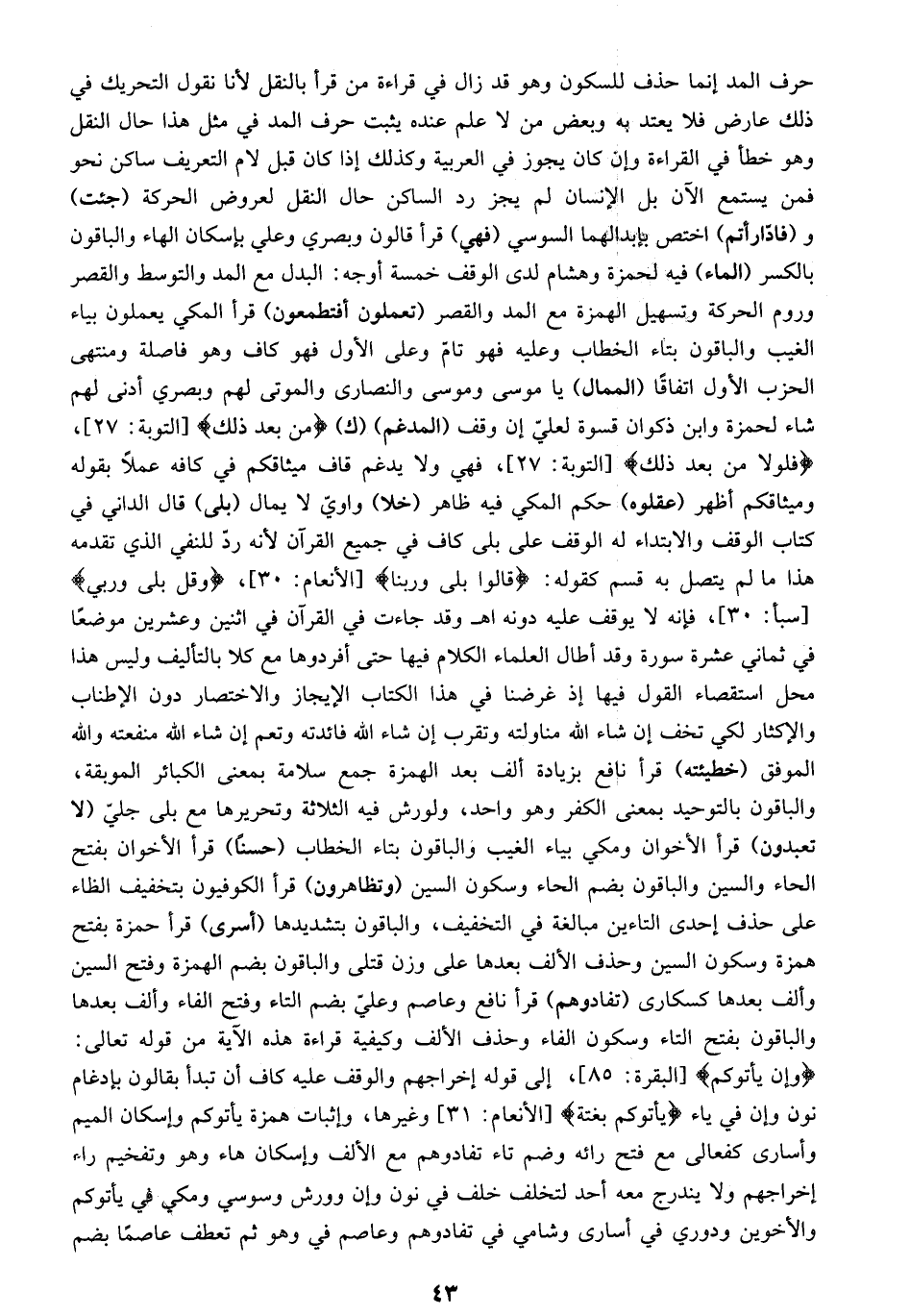 ولحمزة: ثلاثة أوجه كوصل ورش، فبلغ العدد ما ذكر ولا أعني بقولي من كذا إلى كذا كذا كذا وجها أن كل وجه يخالف الآخر في كل أمر بل تكفي المخالفة ولو (¬1) في وجه واحد، وهذا الضرب اعتنى به من تساهل من المتأخرين، وقرءوا به وذكروه في كتبهم، وبعضهم أفردوه بالتأليف، وهو خلاف الصواب، ولم يسمح لي شيخنا- رحمه الله تعالى- بالقراءة به؛ لأن فيه تركيب الطرق وتخليطها، وقال الجعبري هو ممتنع في كلمة، وكذا في