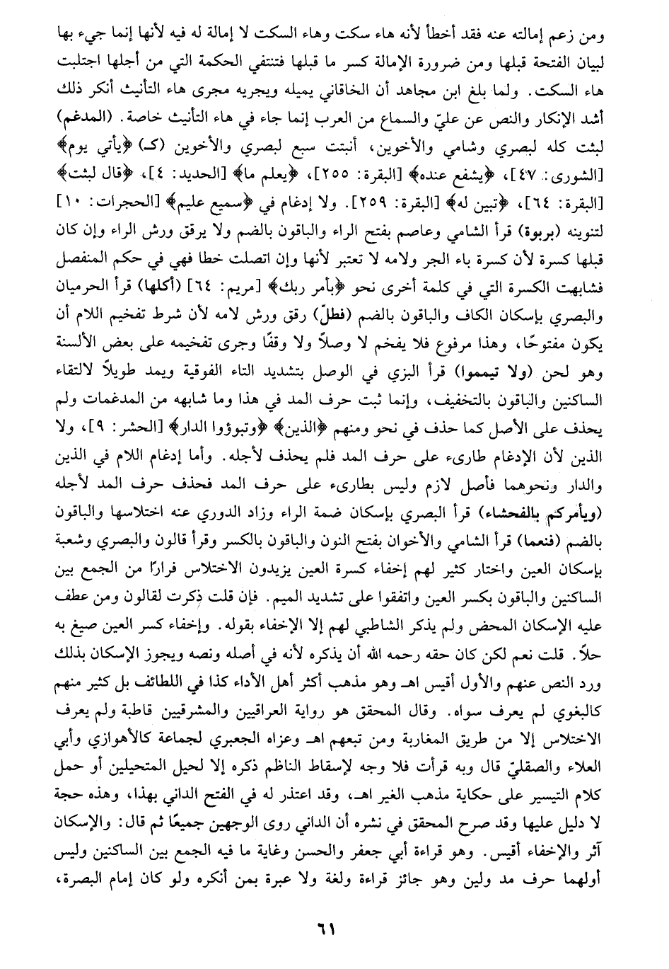 والمجرور وفتح المنصوب، قلت: شراحه ومن بعدهم مقلدون له، ولشارحه الأول: أبي الحسن السخاوي فهم، وإن تعددوا حكمهم حكم رجل واحد، ولم أر أحدا منهم صرح أنه قرأ به بل صرحوا أنهم قرءوا بالإمالة مطلقا وهو الحق الذي لا شك فيه، ولم يذكر الداني- رحمه الله تعالى- في كتاب الإمالة ولا غيره سواء، وحكى غير واحد من أئمتنا الإجماع عليه. فإن قلت ذكره مكي في الكشف.