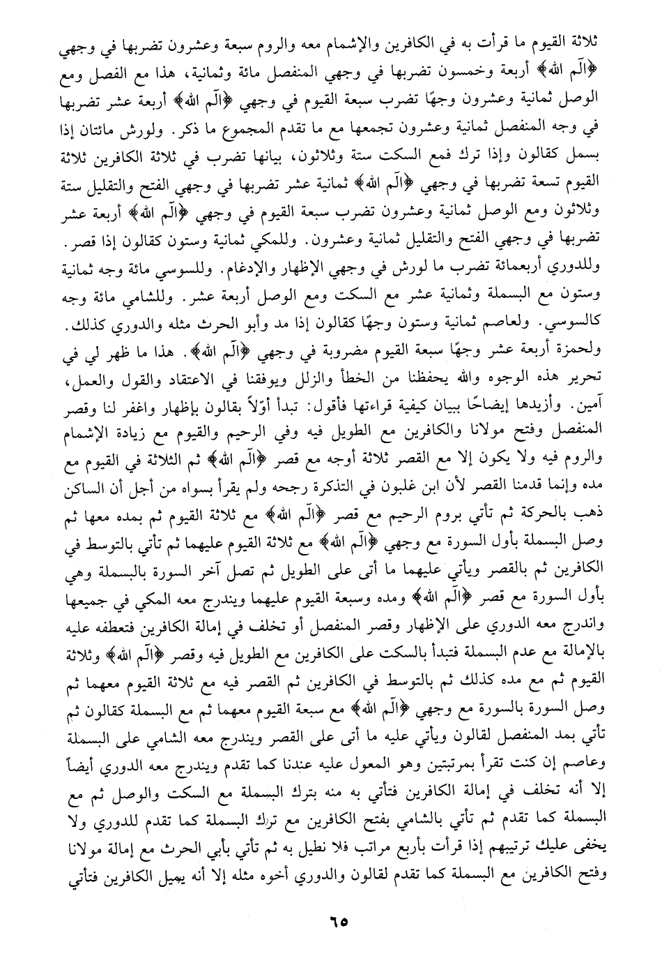 34 - بِهِ كَثِيراً* لا خلاف بين القراء أن هاء الضمير إذا تقدمها متحرك أنها توصل لكن إن كان قبلها فتح، أو ضم نحو (له) وصاحِبَةٌ* توصل بواو، وإن كان كسر نحو فِي رَبِّهِ فتوصل بياء، وكثيرا لا خلاف في ترقيق رائه من طريق القصيد لورش.