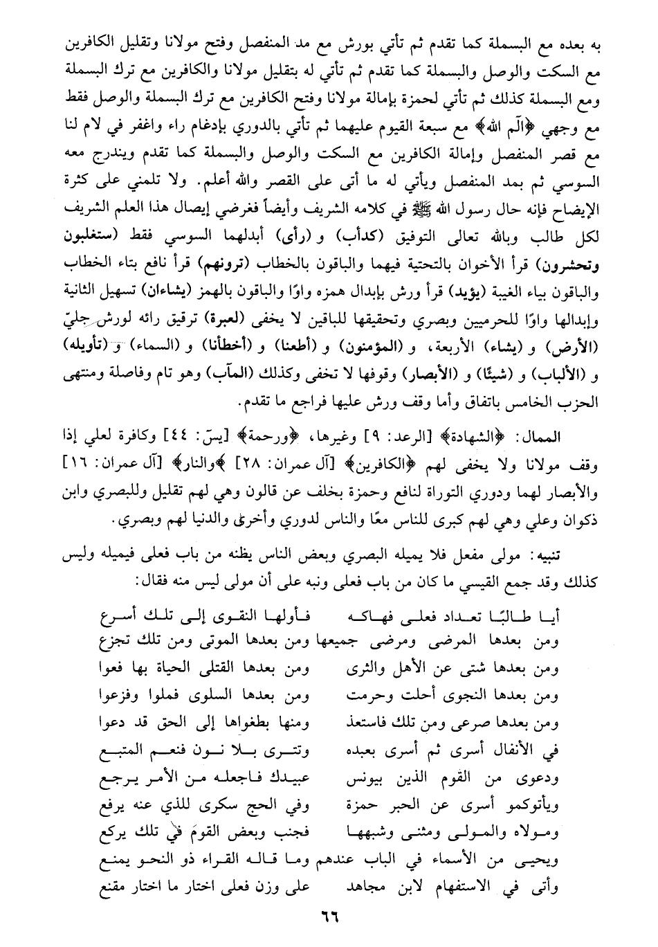 (¬1) إذا قال معا يقصد ورود هذا اللفظ في موضعين، والقراءة في الموضعين واحدة، كقول الله تعالى: إِنِّي أَعْلَمُ ما لا تَعْلَمُونَ الآية (30)، وإِنِّي أَعْلَمُ غَيْبَ السَّماواتِ وَالْأَرْضِ وَأَعْلَمُ ما تُبْدُونَ وَما كُنْتُمْ تَكْتُمُونَ الآية (33) من البقرة، فالقراءة في الموضعين واحدة.