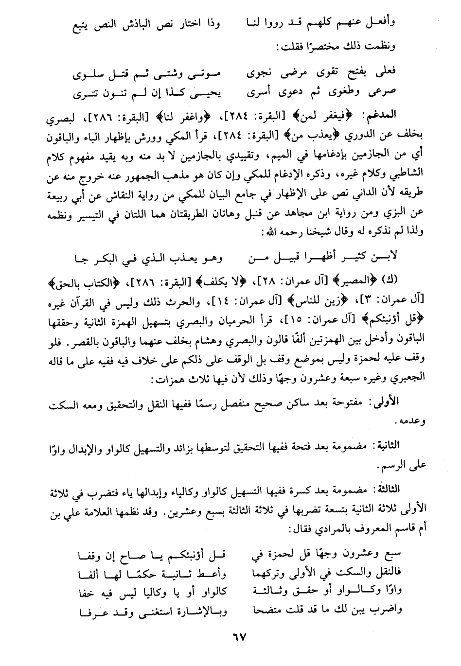 فإذا علمت هذا وأردت قراءة هذه الآية من وعلم آدم إلى صادقين، وبعض الناس يقف على الملائكة، وليس بموضع وقف إلا في ضرورة فيأتي فيها واحد وثمانون وجها وكلها صحيحة، ولا تركيب فيها، وأما لو عددنا الضعيف وتركيب الأوجه لكان أكثر من هذا.