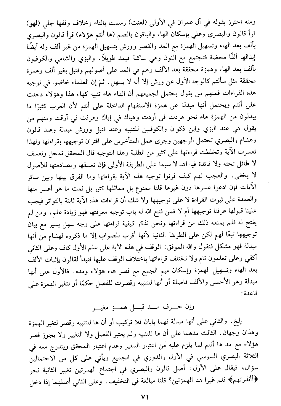 التقليل، ولم أقرأ على شيخنا من طريق الشاطبية إلا بها، وقرأ هو بذلك على شيخنا سلطان بن أحمد، والوجه الخامس إنما هو من طريق الطيبة كما ذكره الشيخ سلطان في جواب الأسئلة، ولا فرق في الأربعة أوجه بين أن يتقدم ما فيه التقليل على مد البدل كهذه الآية أو يتأخر كقوله: اسْجُدُوا لِآدَمَ فَسَجَدُوا إِلَّا إِبْلِيسَ أَبى * فيأتي على القصر في آدم الفتح في أبى، وعلى التوسط التقليل، وعلى الطويل الفتح والتقليل، وقس على هذا نظائره والله أعلم.