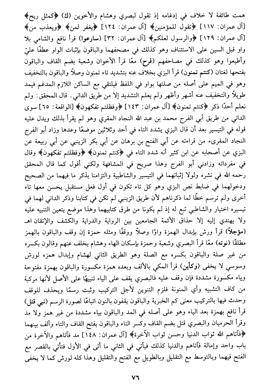 (موسى كلمه) ومُوسَى الْكِتابَ* إن وقف عليه، السَّلْوى * لهم وبصري بارِئِكُمْ* معا لدوري عليّ، نَرَى اللَّهَ إن وقف على نرى لهم وبصري، وإن وصل فأمال السوسي الراء بخلف عنه، ويتفرع الإمالة في اسم الجلالة تغليظ اللام وترقيقها لعدم وجود الكسر الخالص والفتح الخالص فله ثلاثة أوجه: فتح الراء مع التفخيم وإمالة الراء معه ومع الترقيق، وهذا بخلاف ما إذا رققت الراء لورش قبل اسم الجلالة نحو أَفَغَيْرَ اللَّهِ أَبْتَغِي وَلَذِكْرُ اللَّهِ ويُبَشِّرُ اللَّهُ فلا يجوز في اسم الجلالة إلا التفخيم لوقوعها بعد ضمة أو فتحة خالصة، ولا عبرة بترقيق الراء، وقد جزم به المحقق ونقله عن غير واحد وهو ظاهر وبه قرأنا على جميع شيوخنا وبه نأخذ.